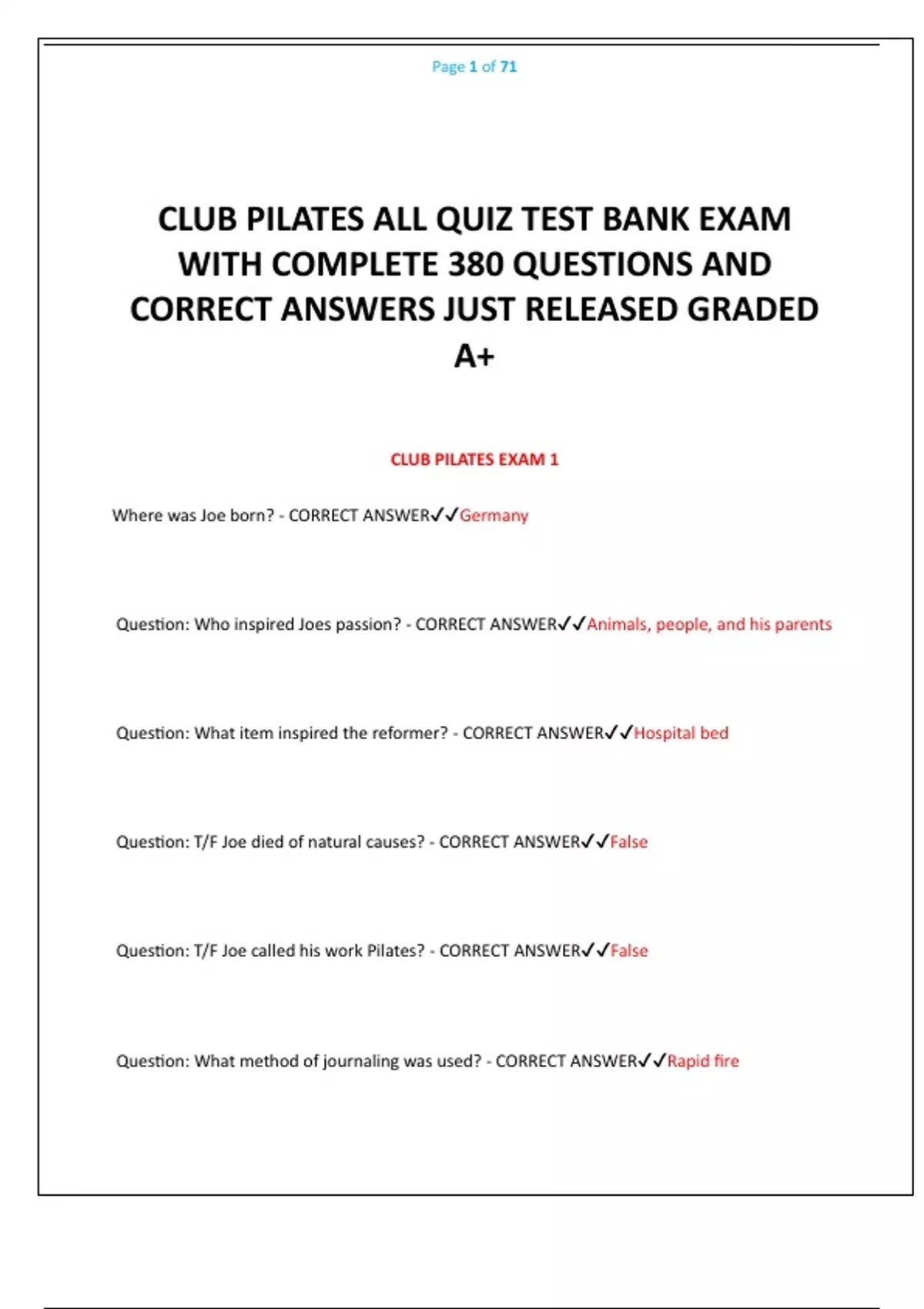 CLUB PILATES ALL QUIZ TEST BANK EXAM WITH COMPLETE 380 QUESTIONS AND CORRECT ANSWERS JUST RELEASED GRADED A+