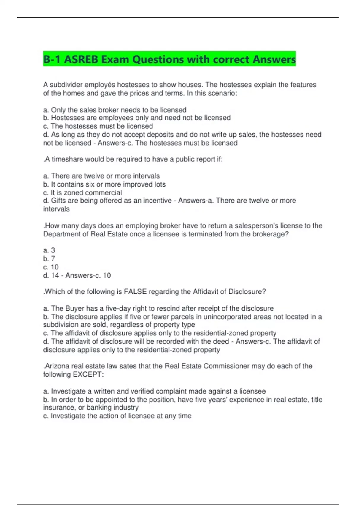 Answers-d. Hold an active real estate license while acting as Real Estate Commissioner