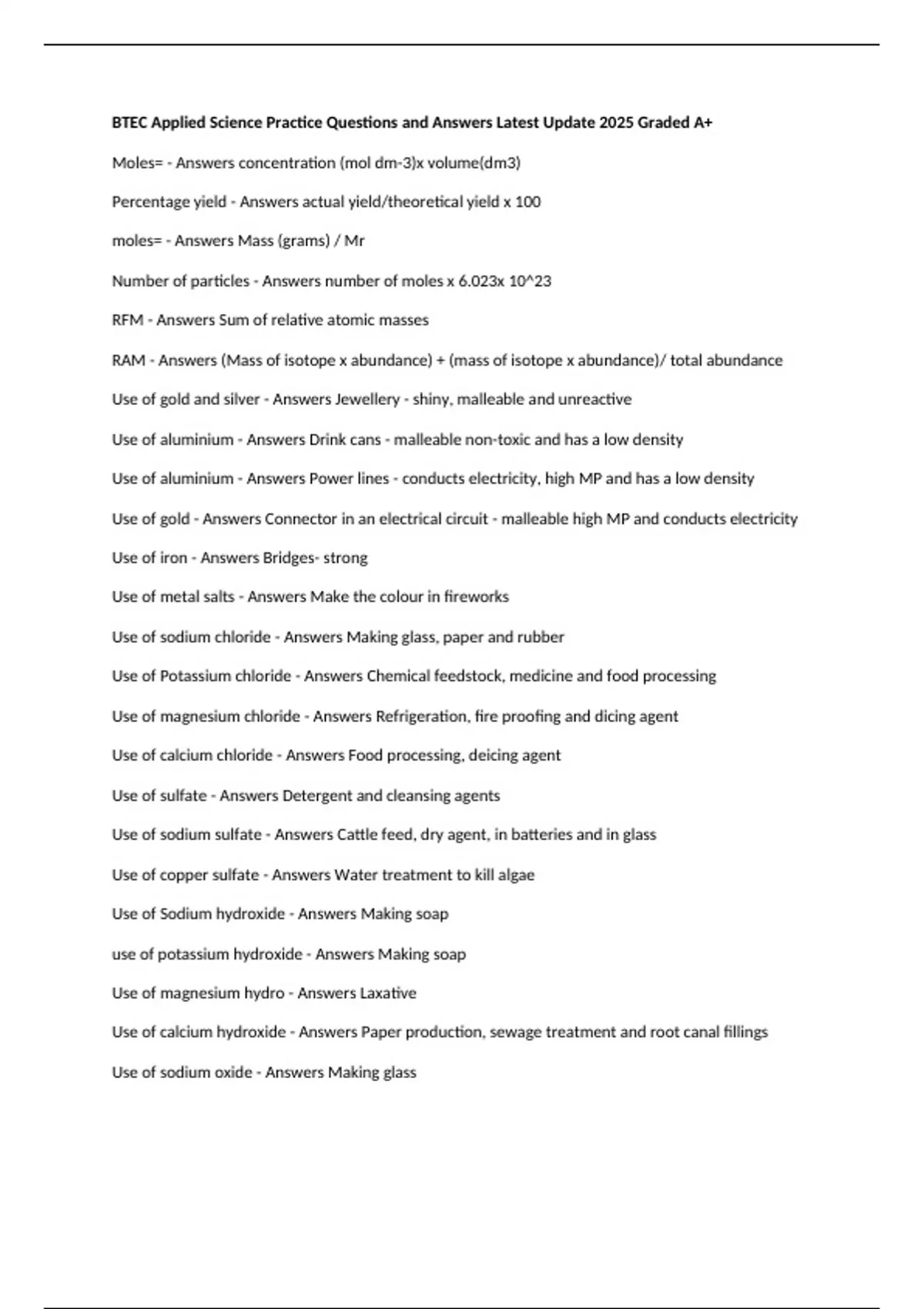 BTEC Applied Science Practice Questions and Answers Latest Update 2025 Graded A+ Moles= - Answers concentration (mol dm-3)x volume(dm3) Percentage yield - Answers actual yield/theoretical yield x 100 moles= - Answers Mass (grams) / Mr Number of particles - Answers number of moles x 6.023x 10^23 RFM - Answers Sum of relative atomic masses RAM - Answers (Mass of isotope x abundance) + (mass of isotope x abundance)/ total abundance Use of gold and silver - Answers Jewellery - shiny, malleable and unreactive Use of aluminium - Answers Drink cans - malleable non-toxic and has a low density Use of aluminium - Answers Power lines - conducts electricity, high MP and has a low density Use of gold - Answers Connector in an electrical circuit - malleable high MP and conducts electricity Use of iron - Answers Bridges- strong Use of metal salts - Answers Make the colour in fireworks Use of sodium chloride - Answers Making glass, paper and rubber Use of Potassium chloride - Answers Chemical feedstock, medicine and food processing Use of magnesium chloride - Answers Refrigeration, fire proofing and dicing agent Use of calcium chloride - Answers Food processing, deicing agent Use of sulfate - Answers Detergent and cleansing agents Use of sodium sulfate - Answers Cattle feed, dry agent, in batteries and in glass Use of copper sulfate - Answers Water treatment to kill algae Use of Sodium hydroxide - Answers Making soap use of potassium hydroxide - Answers Making soap Use of magnesium hydro - Answers Laxative Use of calcium hydroxide - Answers Paper production, sewage treatment and root canal fillings Use of sodium oxide - Answers Making glass Use of potassium oxide - Answers Fertiliser Use of magnesium oxide - Answers Indigestion tablets, starter material in alloys and fibre glass production Use of calcium oxide - Answers Making glass and in cement Use of carbon dioxide - Answers Refrigerant, fire extinguisher Use of Nitrogen dioxide - Answers Production of nitric acid and dyes Use of silicon dioxide - Answers Making glass and concrete Use of phosphorus pentoxide - Answers Dehydrating agent Use of soldier dioxide - Answers Disinfectant, refrigerant Oxidation - Answers loss of electrons, gain of oxygen, increase in oxidation number Reduction - Answers loss of oxygen, gain of electrons, decrease in oxidation number redox reaction - Answers When oxidation and reduction both occur Reactivity of metals down group 1 and 2 - Answers Increases. More electron shells More shielding Outer electrons is further away from the nucleus Outer electrons is less attracted to the nucleus Outer electrons is more easily lost Reactivity of metal across periods 2 and 3 - Answers Decreases. More protons No change in shielding Outer electrons is closer to the nucleus Outer electrons is more attracted to the nucleus Outer electrons are harder to lose Reactivity series of metals - Answers Potassium, sodium, calcium, magnesium, aluminium, zinc, iron, copper, silver, gold, (sometimes, people call me a zebra in class she grunts)