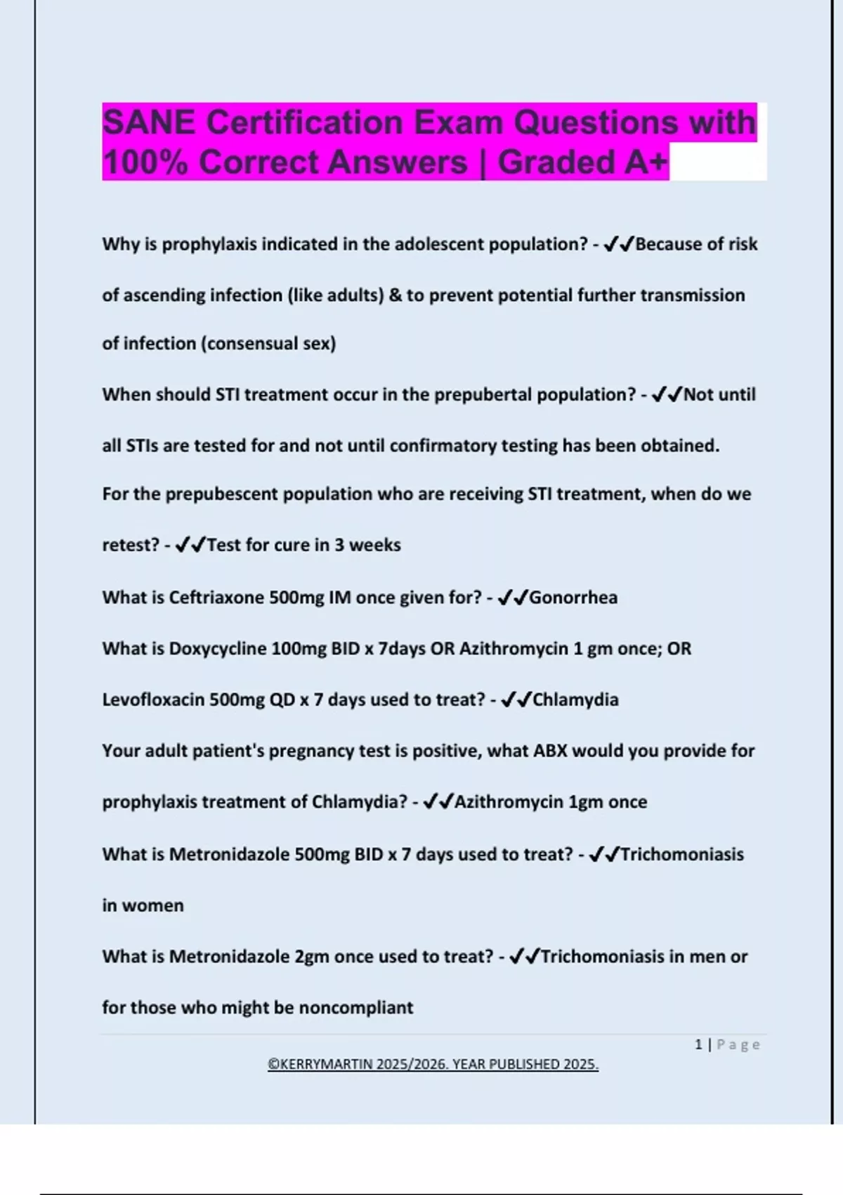 SANE Certification Exam Questions with 100% Correct Answers | Graded A+ Why is prophylaxis indicated in the adolescent population? - Because of risk of ascending infection (like adults) & to prevent potential further transmission of infection (consensual sex) When should STI treatment occur in the prepubertal population? - Not until all STIs are tested for and not until confirmatory testing has been obtained. For the prepubescent population who are receiving STI treatment, when do we retest? - Test for cure in 3 weeks What is Ceftriaxone 500mg IM once given for? - Gonorrhea What is Doxycycline 100mg BID x 7days OR Azithromycin 1 gm once; OR Levofloxacin 500mg QD x 7 days used to treat? - Chlamydia Your adult patient's pregnancy test is positive, what ABX would you provide for prophylaxis treatment of Chlamydia? - Azithromycin 1gm once What is Metronidazole 500mg BID x 7 days used to treat? - Trichomoniasis in women What is Metronidazole 2gm once used to treat? - Trichomoniasis in men or for those who might be noncompliant