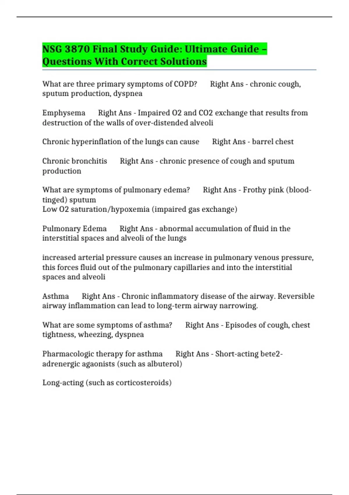 NSG 3870 Final Study Guide: Ultimate Guide – Questions With Correct Solutions