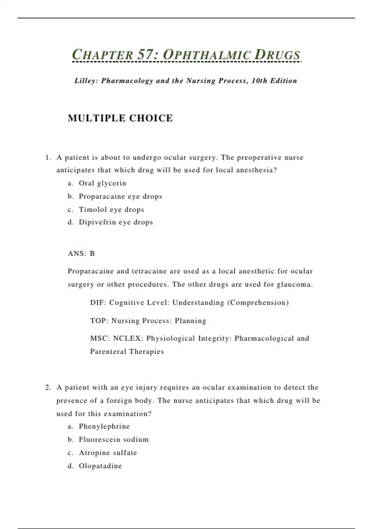Lilley: Pharmacology and the Nursing Process, 10th Edition MULTIPLE CHOICE 1. A patient is about to undergo ocular surgery. The preoperative nurse anticipates that which drug will be used for local anesthesia? a. Oral glycerin b. Proparacaine eye drops c. Timolol eye drops d. Dipivefrin eye drops ANS: B Proparacaine and tetracaine are used as a local anesthetic for ocular surgery or other procedures. The other drugs are used for glaucoma. DIF: Cognitive Level: Understanding (Comprehension) TOP: Nursing Process: Planning MSC: NCLEX: Physiological Integrity: Pharmacological and Parenteral Therapies 2. A patient with an eye injury requires an ocular examination to detect the presence of a foreign body. The nurse anticipates that which drug will be used for this examination? a. Phenylephrine b. Fluorescein sodium c. Atropine sulfate d. Olopatadine ANS: B Fluorescein sodium is an ophthalmic diagnostic dye used to identify corneal defects and to locate foreign objects in the eye. Phenylephrine is an ocular decongestant; atropine sulfate has mydriatic and cycloplegic effects, which are useful for examining the inner eye structures; olopatadine is an ophthalmic antihistamine. DIF: Cognitive Level: Understanding (Comprehension) TOP: Nursing Process: Planning MSC: NCLEX: Physiological Integrity: Pharmacological and Parenteral Therapies 3. The nurse is administering antibiotic eyedrops to a patient for the first time. After the first drop is given, the patient states, “That eyedrop is making my eye sting! Is that normal?” Which is the best response by the nurse? a. “That is unusual. Let me rinse the medication from your eye.” b. “Sometimes these eyedrops may cause burning and stinging, but it should go away soon.” c. “These may be serious side effects, so I will notify your doctor before the next dose is due.” d. “Let’s wait and see if these effects happen the next time you receive these drops.”