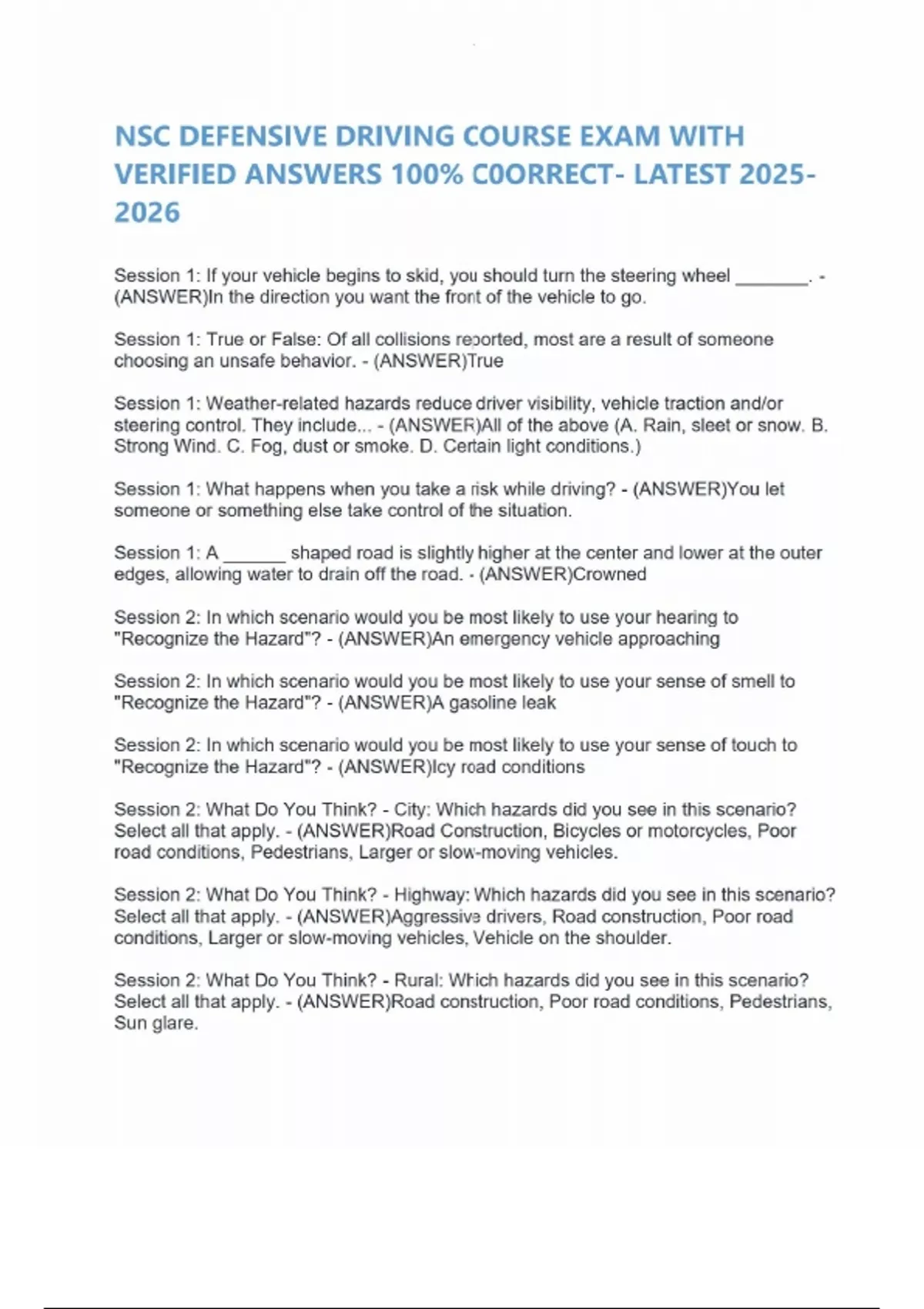 NSC DEFENSIVE DRIVING COURSE EXAM WITH VERIFIED ANSWERS 100% C0ORRECT- LATEST Session 1: If your vehicle begins to skid, you should turn the steering wheel _______. - (ANSWER)In the direction you want the front of the vehicle to go. Session 1: True or False: Of all collisions reported, most are a result of someone choosing an unsafe behavior. - (ANSWER)True Session 1: Weather-related hazards reduce driver visibility, vehicle traction and/or steering control. They include... - (ANSWER)All of the above (A. Rain, sleet or snow. B. Strong Wind. C. Fog, dust or smoke. D. Certain light conditions.) Session 1: What happens when you take a risk while driving? - (ANSWER)You let someone or something else take control of the situation. Session 1: A ______ shaped road is slightly higher at the center and lower at the outer edges, allowing water to drain off the road. - (ANSWER)Crowned Session 2: In which scenario would you be most likely to use your hearing to "Recognize the Hazard"? - (ANSWER)An emergency vehicle approaching Session 2: In which scenario would you be most likely to use your sense of smell to "Recognize the Hazard"? - (ANSWER)A gasoline leak Session 2: In which scenario would you be most likely to use your sense of touch to "Recognize the Hazard"? - (ANSWER)Icy road conditions Session 2: What Do You Think? - City: Which hazards did you see in this scenario? Select all that apply. - (ANSWER)Road Construction, Bicycles or motorcycles, Poor road conditions, Pedestrians, Larger or slow-moving vehicles. Session 2: What Do You Think? - Highway: Which hazards did you see in this scenario? Select all that apply. - (ANSWER)Aggressive drivers, Road construction, Poor road conditions, Larger or slow-moving vehicles, Vehicle on the shoulder. Session 2: What Do You Think? - Rural: Which hazards did you see in this scenario? Select all that apply. - (ANSWER)Road construction, Poor road conditions, Pedestrians, Sun glare.