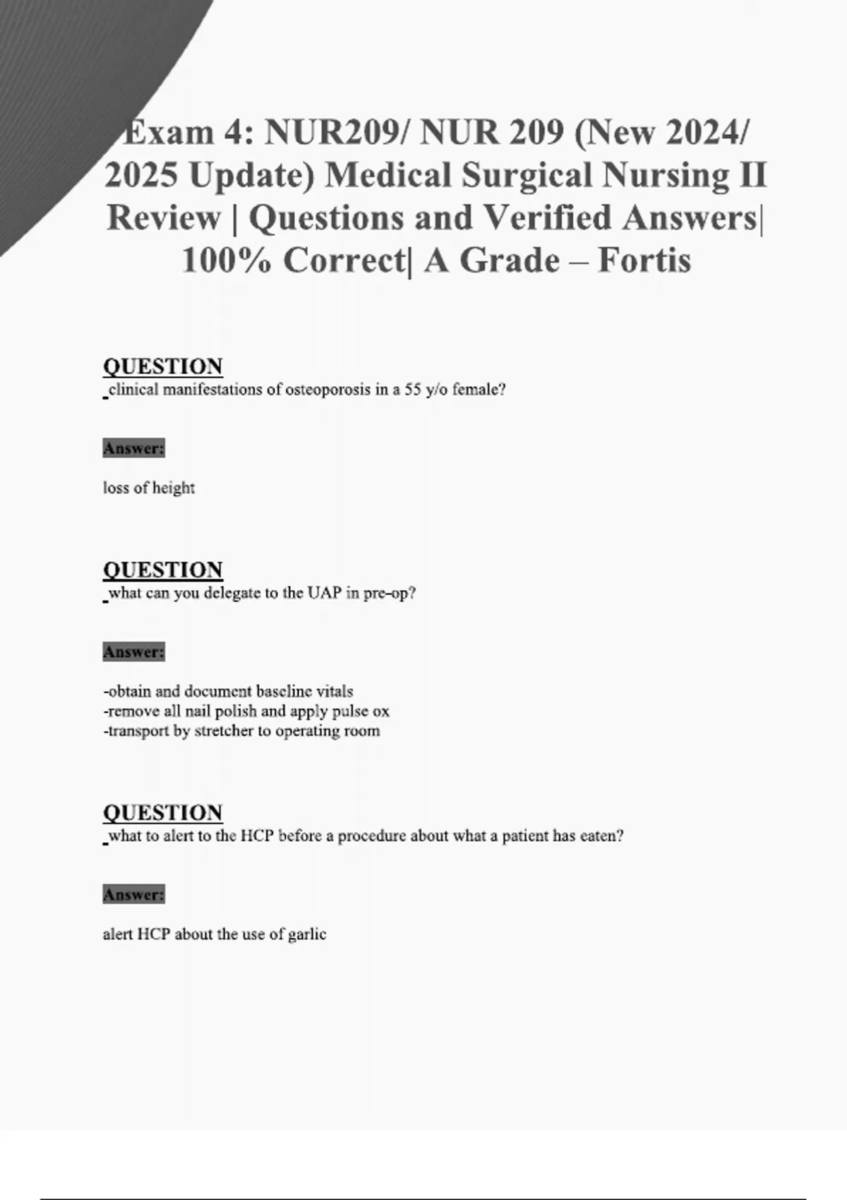 Exam 4: NUR209/ NUR 209 (Latest 2024/ 2025 Update) Medical Surgical Nursing II| Review with Questions and Verified Answers| 100% Correct
