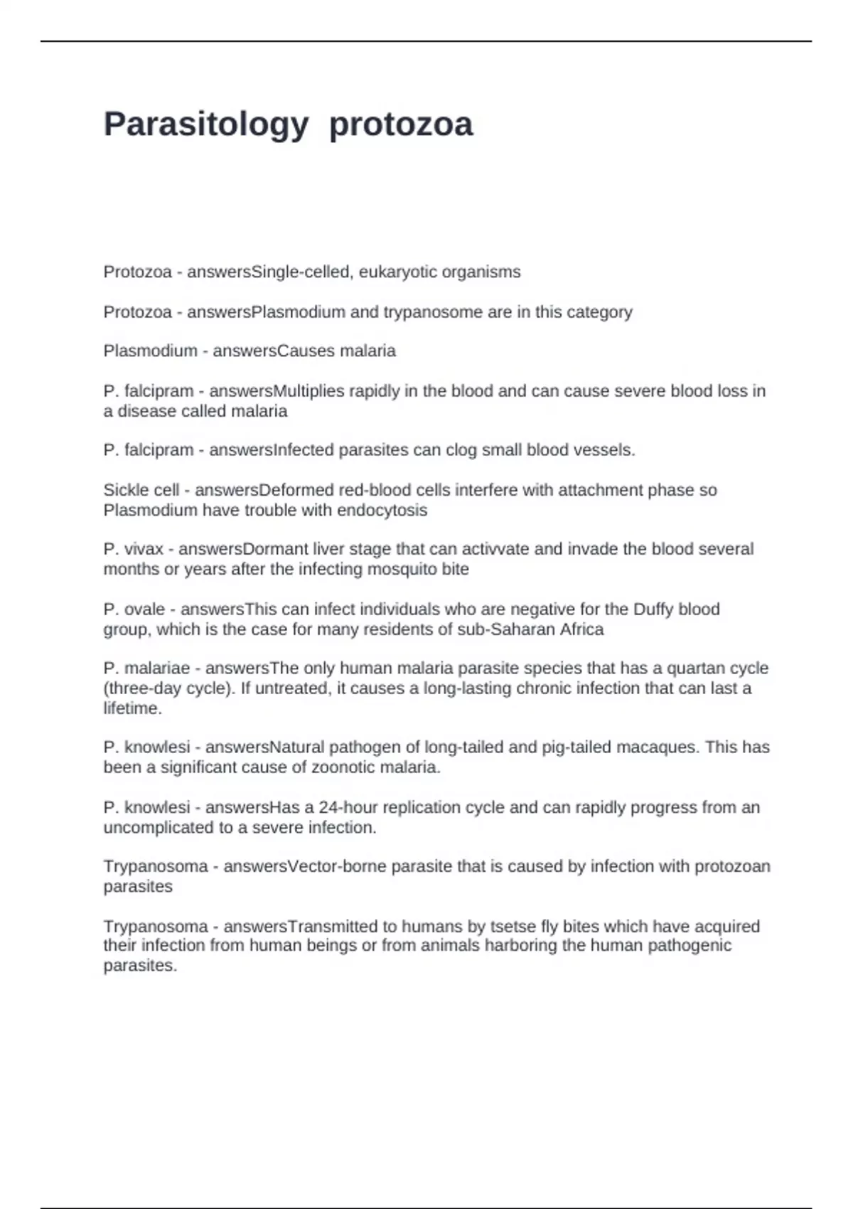 Trypanosoma - answersVector-borne parasite that is caused by infection with protozoan
