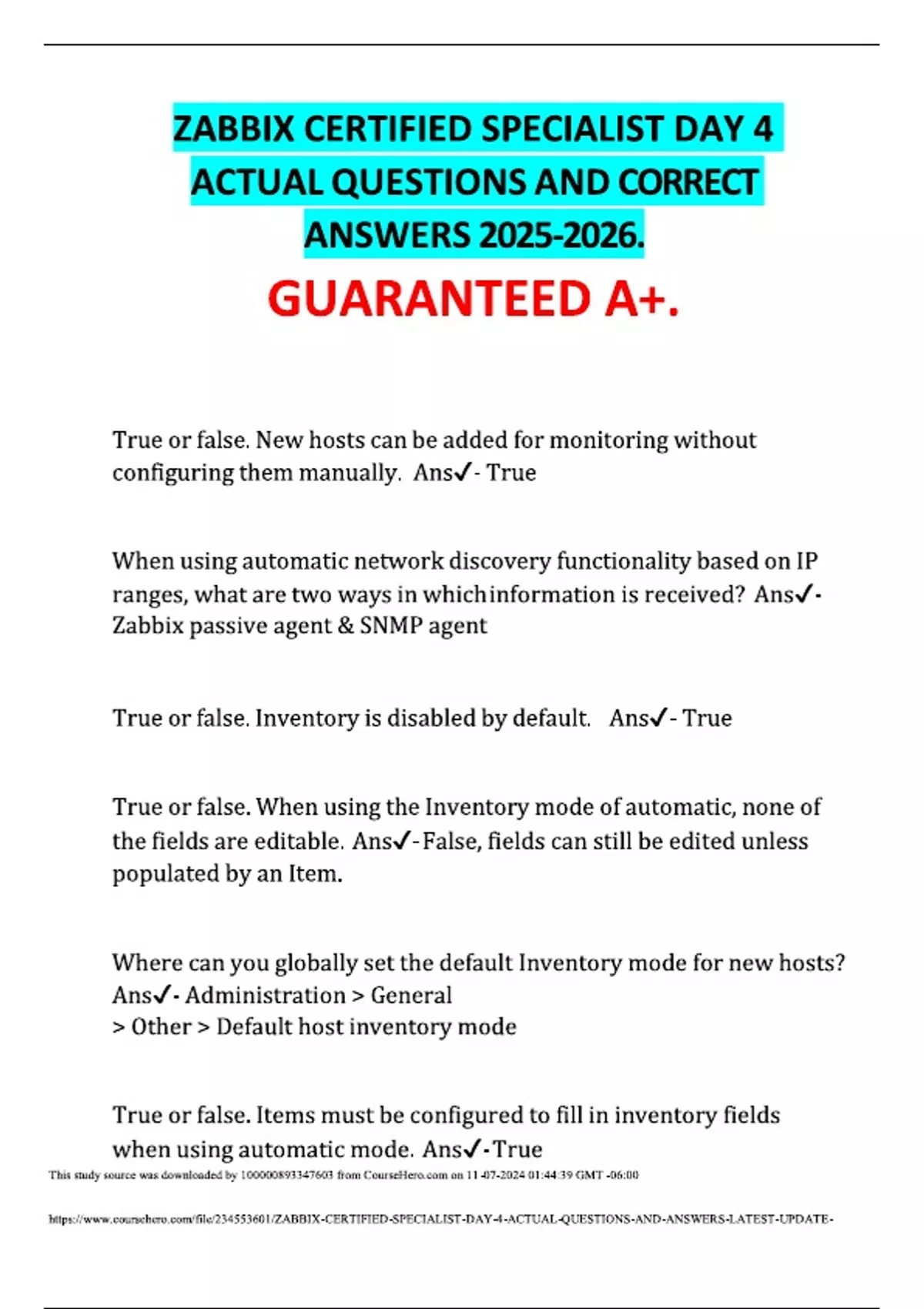 ZABBIX CERTIFIED SPECIALIST DAY . ACTUAL QUESTIONS WITH CORRECT AND VERIFIED ANSWERS. GUARANTEED A+.