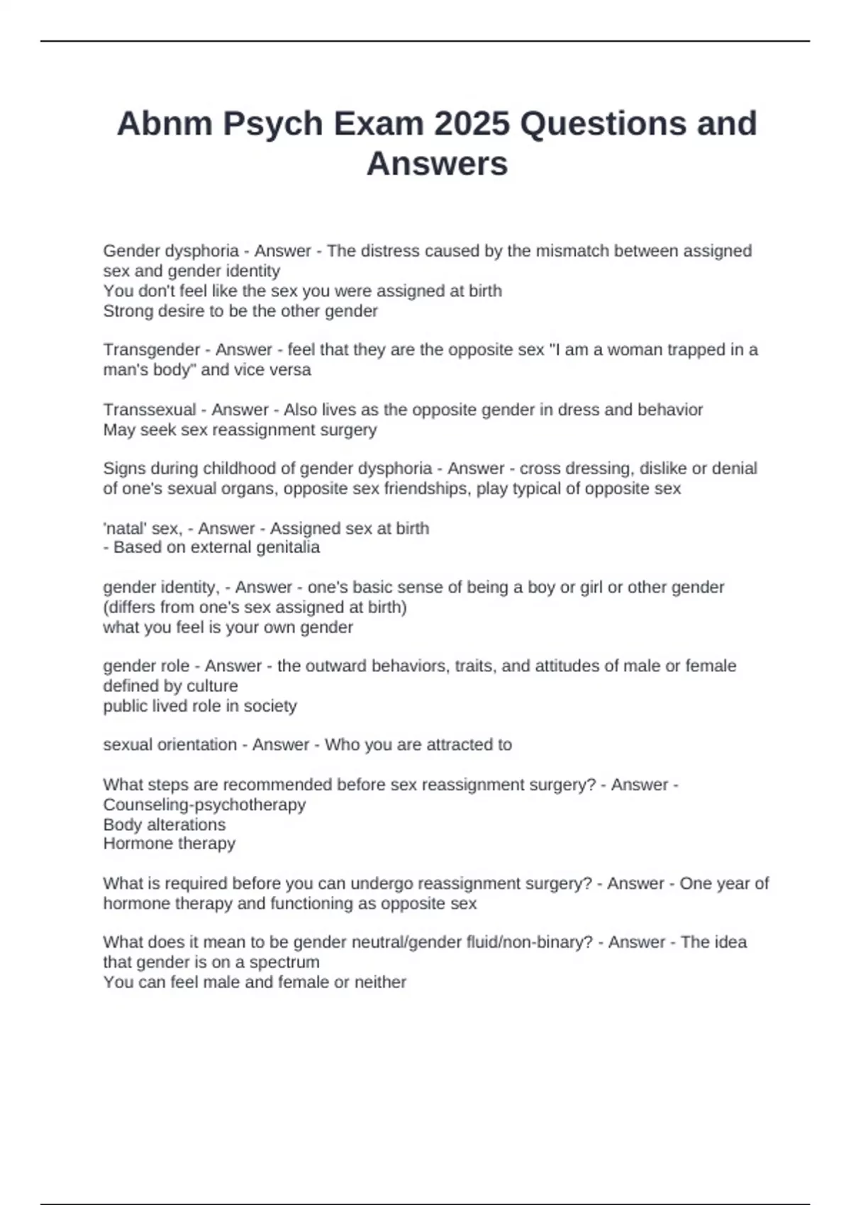 Abnm Psych Exam 2025 Questions and Answers Gender dysphoria The distress caused by the mismatch between assigned sex and gender identity You don't feel like the sex you were assigned at birth Strong desire to be the other gender Transgender feel that they are the opposite sex "I am a woman trapped in a man's body" and vice versa