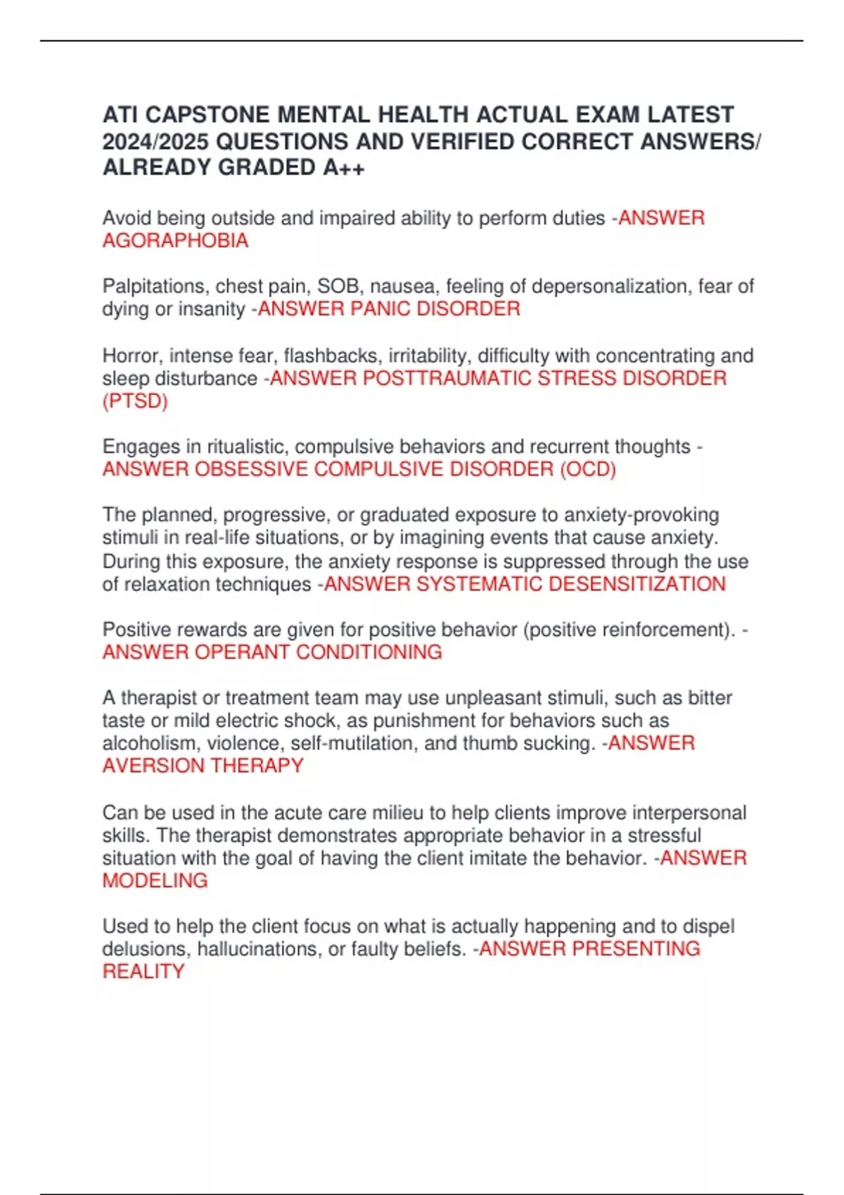 ATI CAPSTONE MENTAL HEALTH ACTUAL EXAM LATEST 2024/2025 QUESTIONS AND VERIFIED CORRECT ANSWERS/ ALREADY GRADED A++ ATI CAPSTONE MENTAL HEALTH ACTUAL EXAM LATEST 2024/2025 QUESTIONS AND VERIFIED CORRECT ANSWERS/ ALREADY GRADED A++