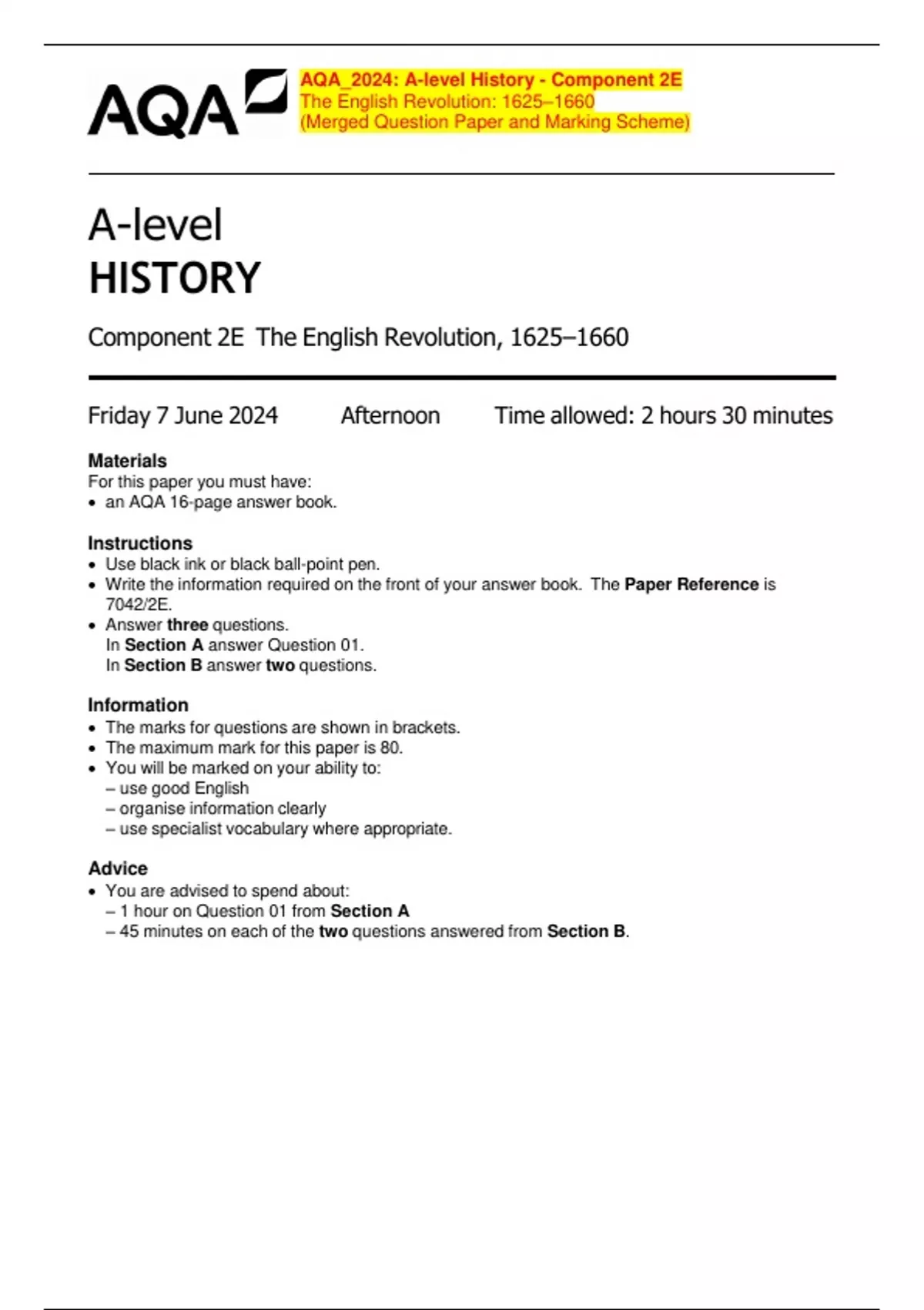 This exam assesses the causes, events, and consequences of the English Revolution, including the conflict
