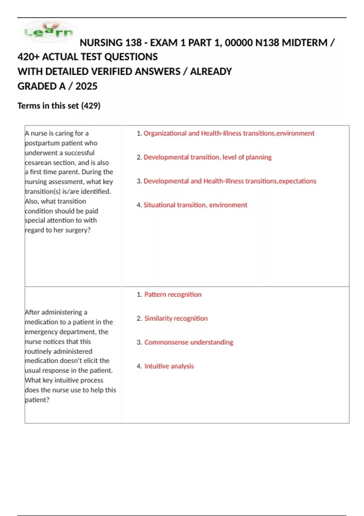 NURSING 138 - EXAM 1 PART 1, 00000 N138 MIDTERM / 420+ ACTUAL TEST QUESTIONS WITH DETAILED VERIFIED ANSWERS / ALREADY GRADED A / 2025 Terms in this set (429)   A nurse is caring for a postpartum patient who underwent a successful cesarean section, and is also a first time parent. During the nursing assessment, what key transition(s) is/are identified. Also, what transition condition should be paid special attention to with regard to her surgery? 1. Organizational and Health-Illness transitions,environment 2. Developmental transition, level of planning 3. Developmental and Health-Illness transitions,expectations 4. Situational transition, environment After administering a medication to a patient in the emergency department, the nurse notices that this routinely administered medication doesn't elicit the usual response in the patient. What key intuitive process does the nurse use to help this patient? 1. Pattern recognition 2. Similarity recognition 3. Commonsense understanding 4. Intuitive analysis
