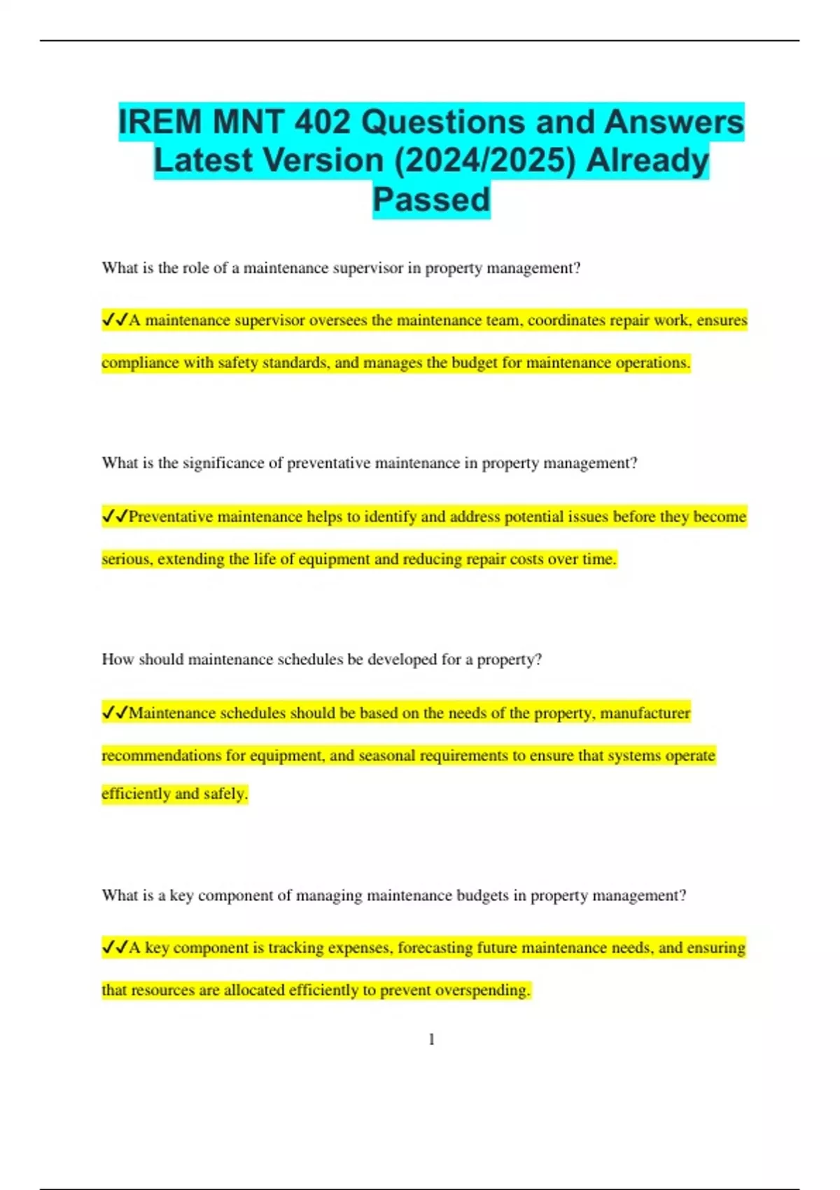 IREM MNT 402 Questions and Answers Latest Version (2024/2025) Already Passed What is the role of a maintenance supervisor in property management? A maintenance supervisor oversees the maintenance team, coordinates repair work, ensures compliance with safety standards, and manages the budget for maintenance operations. What is the significance of preventative maintenance in property management? Preventative maintenance helps to identify and address potential issues before they become serious, extending the life of equipment and reducing repair costs over time. How should maintenance schedules be developed for a property? Maintenance schedules should be based on the needs of the property, manufacturer recommendations for equipment, and seasonal requirements to ensure that systems operate efficiently and safely. What is a key component of managing maintenance budgets in property management? A key component is tracking expenses, forecasting future maintenance needs, and ensuring that resources are allocated efficiently to prevent overspending. 2 Why is it important to maintain a good relationship with service contractors? Maintaining a good relationship with service contractors ensures that issues are addressed promptly, that the property receives high-quality services, and that future work is completed at favorable rates. What is the role of energy management in property maintenance? Energy management focuses on implementing strategies to reduce energy consumption, lower utility costs, and improve the environmental sustainability of the property. What is a building system, and why is it important to maintain it? A building system includes heating, ventilation, air conditioning (HVAC), plumbing, electrical, and safety systems. Maintaining these systems is essential to ensure a safe, comfortable, and functional environment for occupants. What steps should be taken when a maintenance emergency occurs? In the event of a maintenance emergency, immediate action should be taken to assess the situation, contain the issue if possible, and contact the appropriate repair professionals to resolve the problem quickly. 3