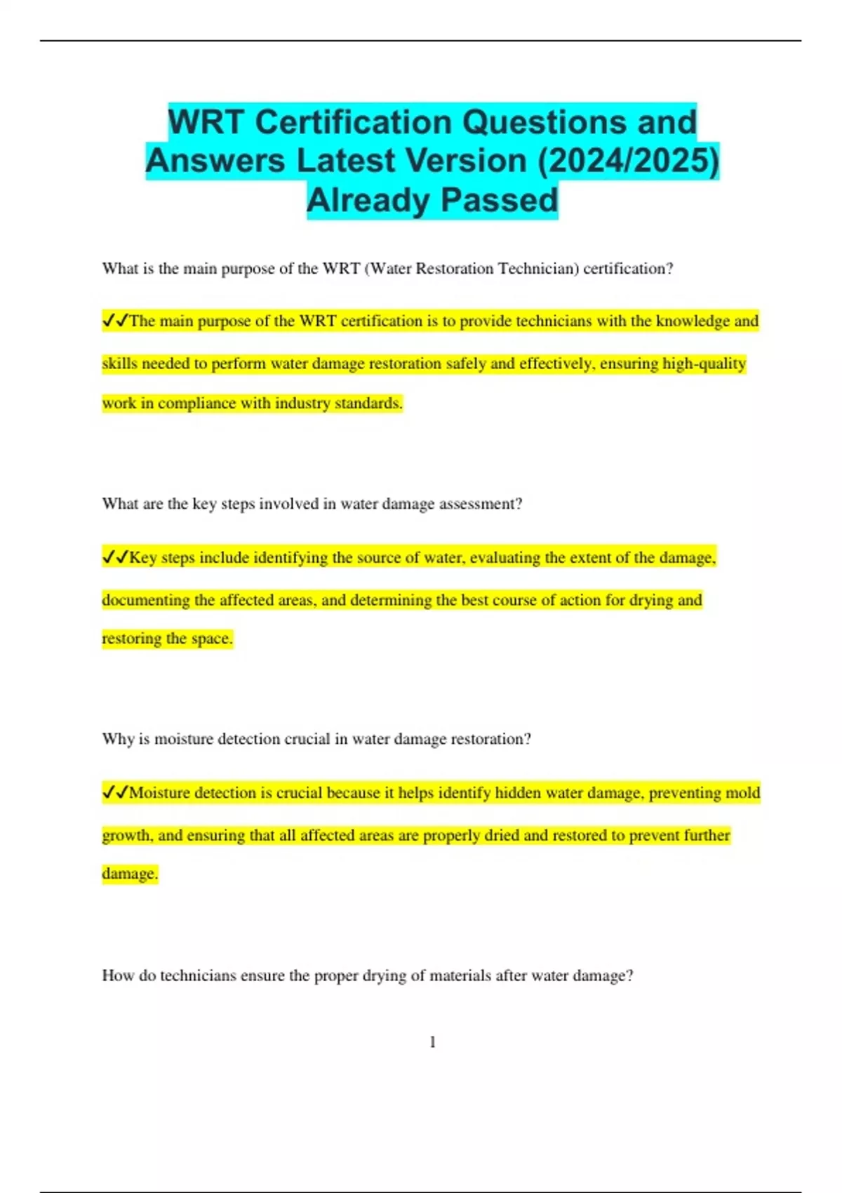 What is the main purpose of the WRT (Water Restoration Technician) certification?