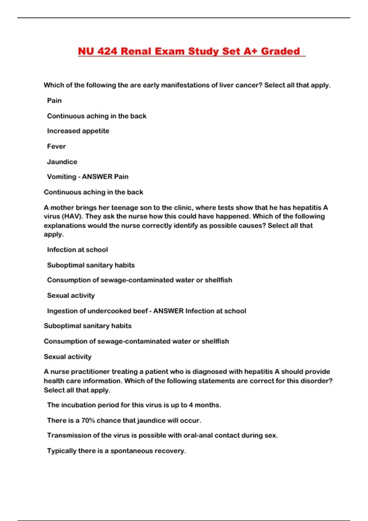 NU 424 Renal Exam Study Set A+ Graded