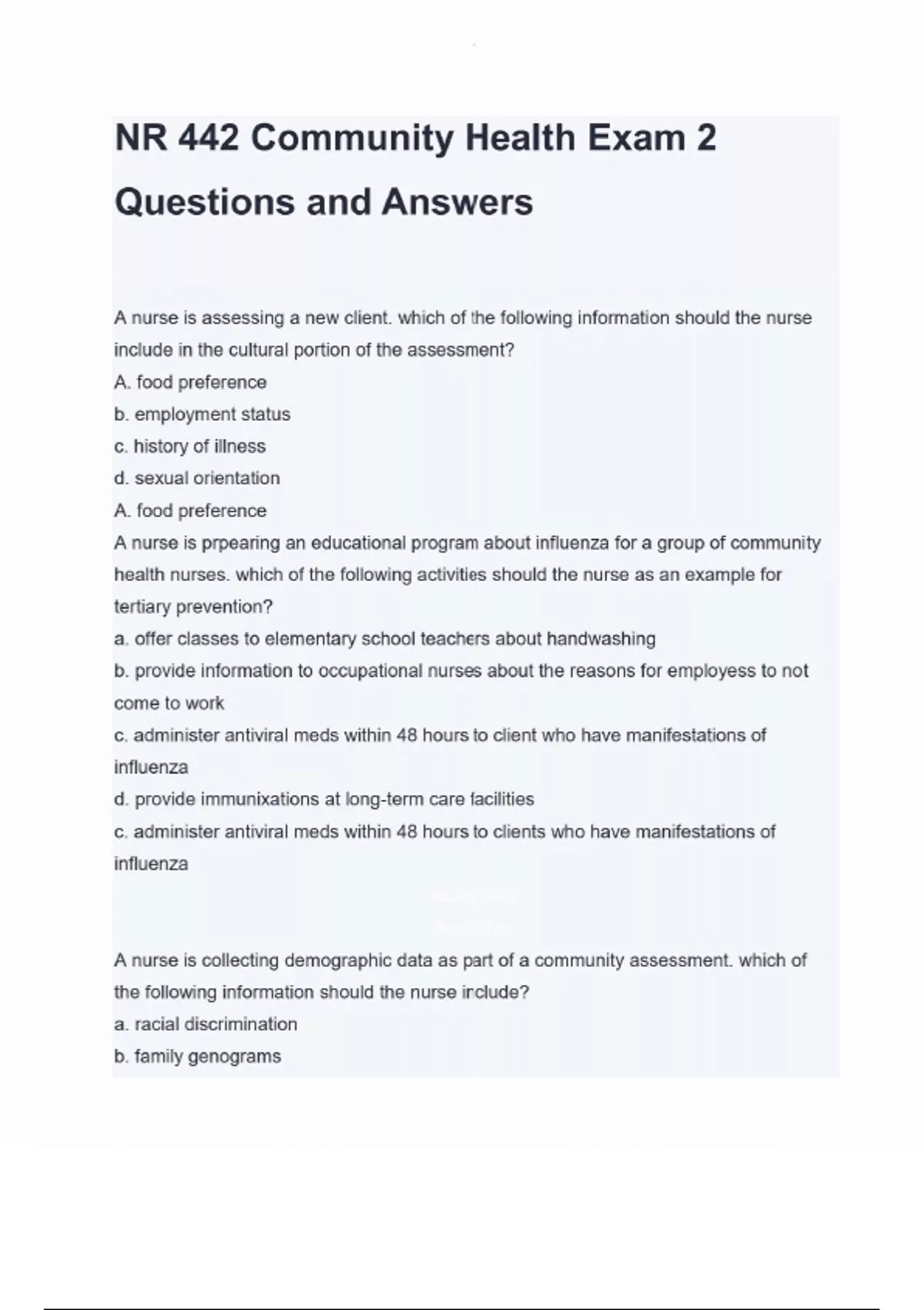 NR 442 Community Health Exam 2 Questions and Answers A nurse is assessing a new client. which of the following information should the nurse include in the cultural portion of the assessment? A. food preference b. employment status c. history of illness d. sexual orientation A. food preference A nurse is prpearing an educational program about influenza for a group of community health nurses. which of the following activities should the nurse as an example for tertiary prevention? a. offer classes to elementary school teachers about handwashing b. provide information to occupational nurses about the reasons for employess to not come to work c. administer antiviral meds within 48 hours to client who have manifestations of influenza d. provide immunixations at long-term care facilities c. administer antiviral meds within 48 hours to clients who have manifestations of influenza Brainpower Read More A nurse is collecting demographic data as part of a community assessment. which of the following information should the nurse include? a. racial discrimination b. family genograms