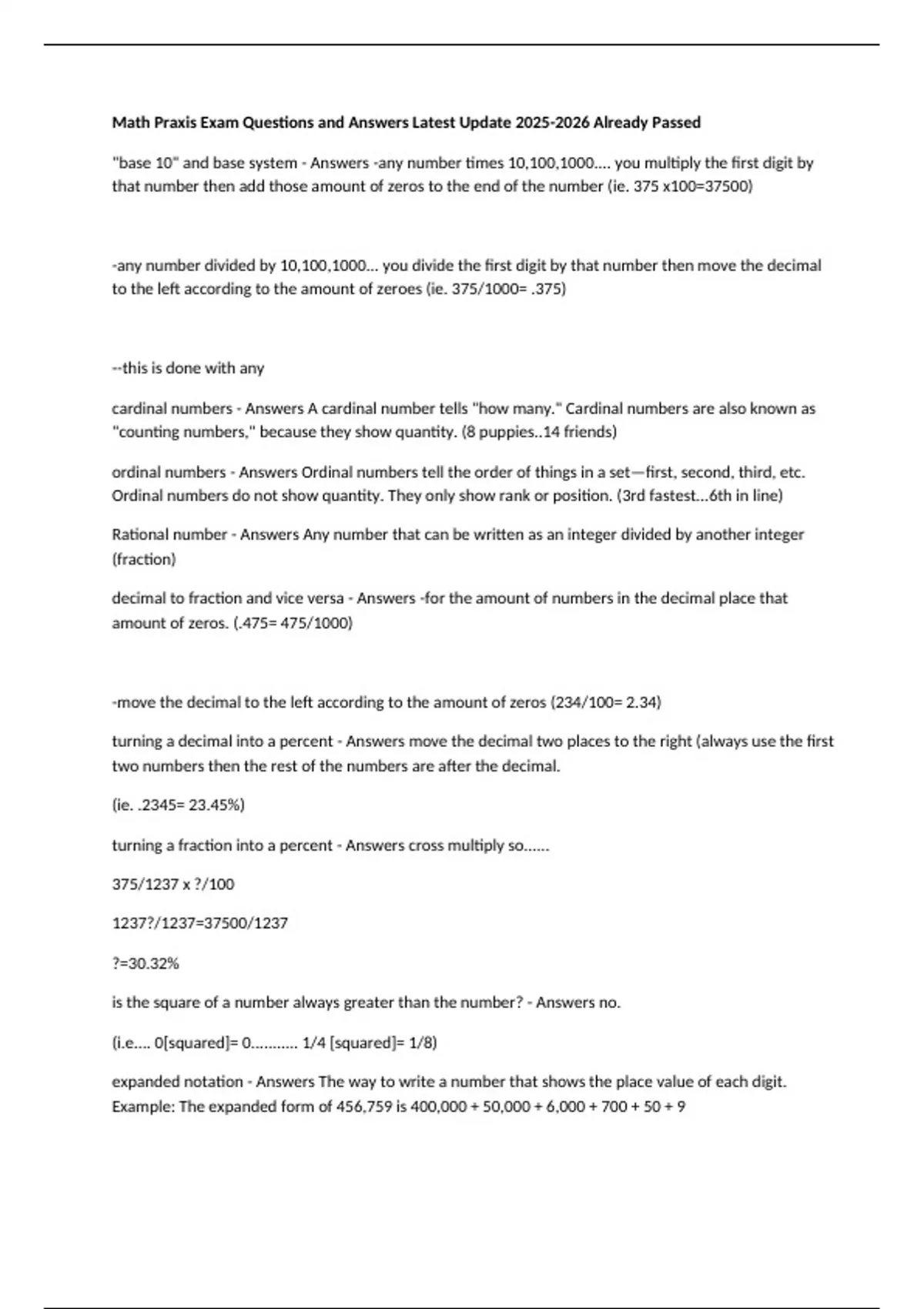 Math Praxis Exam Questions and Answers Latest Update Already Passed "base 10" and base system - Answers -any number times 10,100,1000.... you multiply the first digit by that number then add those amount of zeros to the end of the number (ie. 375 x100=37500) -any number divided by 10,100,1000... you divide the first digit by that number then move the decimal to the left according to the amount of zeroes (ie. 375/1000= .375) --this is done with any cardinal numbers - Answers A cardinal number tells "how many." Cardinal numbers are also known as "counting numbers," because they show quantity. (8 puppies..14 friends) ordinal numbers - Answers Ordinal numbers tell the order of things in a set—first, second, third, etc. Ordinal numbers do not show quantity. They only show rank or position. (3rd fastest...6th in line) Rational number - Answers Any number that can be written as an integer divided by another integer (fraction) decimal to fraction and vice versa - Answers -for the amount of numbers in the decimal place that amount of zeros. (.475= 475/1000) -move the decimal to the left according to the amount of zeros (234/100= 2.34) turning a decimal into a percent - Answers move the decimal two places to the right (always use the first two numbers then the rest of the numbers are after the decimal. (ie. .2345= 23.45%) turning a fraction into a percent - Answers cross multiply so...... 375/1237 x ?/100 1237?/1237=37500/1237 ?=30.32% is the square of a number always greater than the number? - Answers no. (i.e.... 0[squared]= 0........... 1/4 [squared]= 1/8) expanded notation - Answers The way to write a number that shows the place value of each digit. Example: The expanded form of 456,759 is 400,000 + 50,000 + 6,000 + 700 + 50 + 9 scientific notation - Answers using powers of 10 (i.e 10 ^4) to express large numbers (i.e 43,700 is written in scientific notation as 4.37x10 ^4... or 43.7 x10 ^3) how to reverse scientific notation - Answers 43.7 x 10^3 = 43700 prime numbers - Answers a number that has only 2 factors, one and itself composite numbers - Answers A positive integer that has factors other than just 1 and the number itself factor - Answers any whole numbers that when multiplied together form a product. Example: factors of 12 are 1,2,3,4,6,12 multiples - Answers the result of multiplying any whole number by the counting numbers Example: multiples of 7 are 7,14,21,28... are 1 and 2 prime numbers? - Answers 1--no 2--yes is zero and even or odd number - Answers even bc it is in between odd numbers is the sum of two even numbers always even? what about the sum of two odd numbers? - Answers sum of two even-YES sum of two odd-NO (1+1=2) what is the formula for percent increase - Answers new number - old number/old number=x times 100 if a movie ticket was $5 last week and this feel is $6 what was the percent increase - Answers 6-5=1/5x100=.20 ..... 20% increase area of a circle - Answers π × r2 Circumference = 2 × π × r r = radius how to get the radius - Answers half the Diameter (length from one end to the other) area of a rectangle - Answers Area = w × h w = width h = height