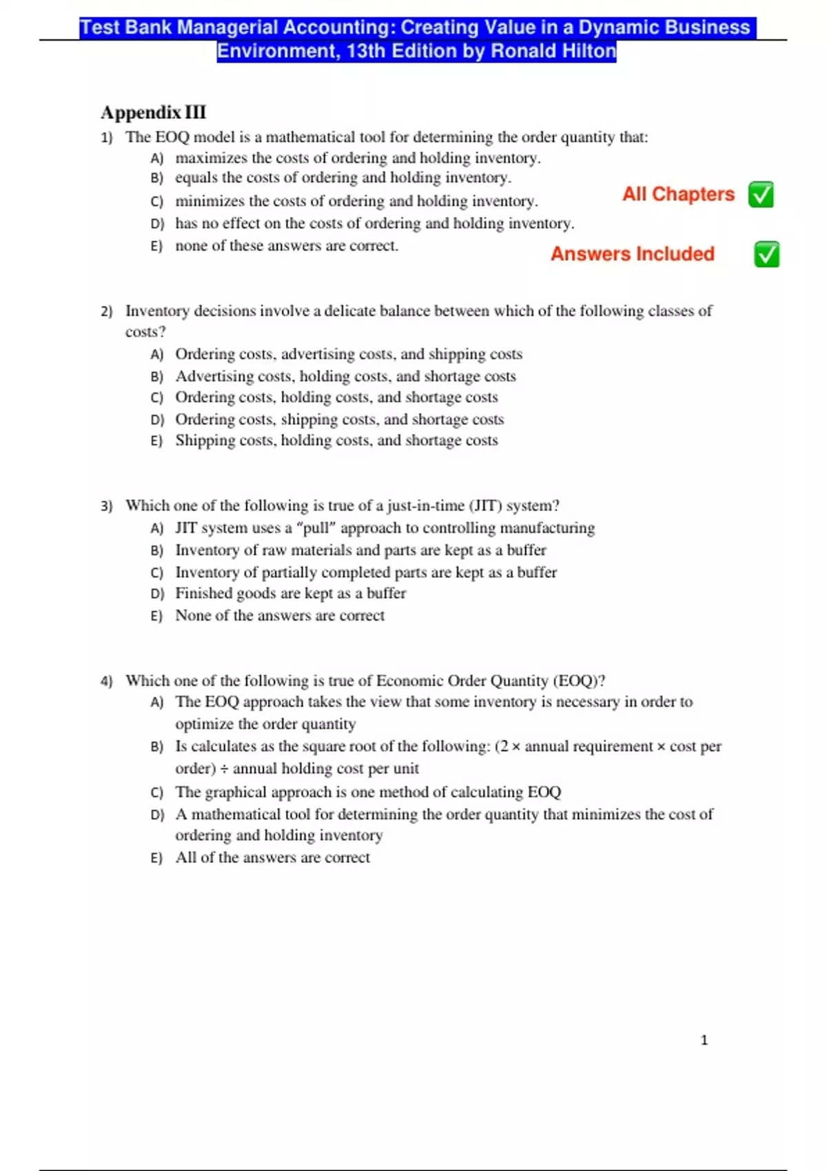 1) The EOQ model is a mathematical tool for determining the order quantity that: