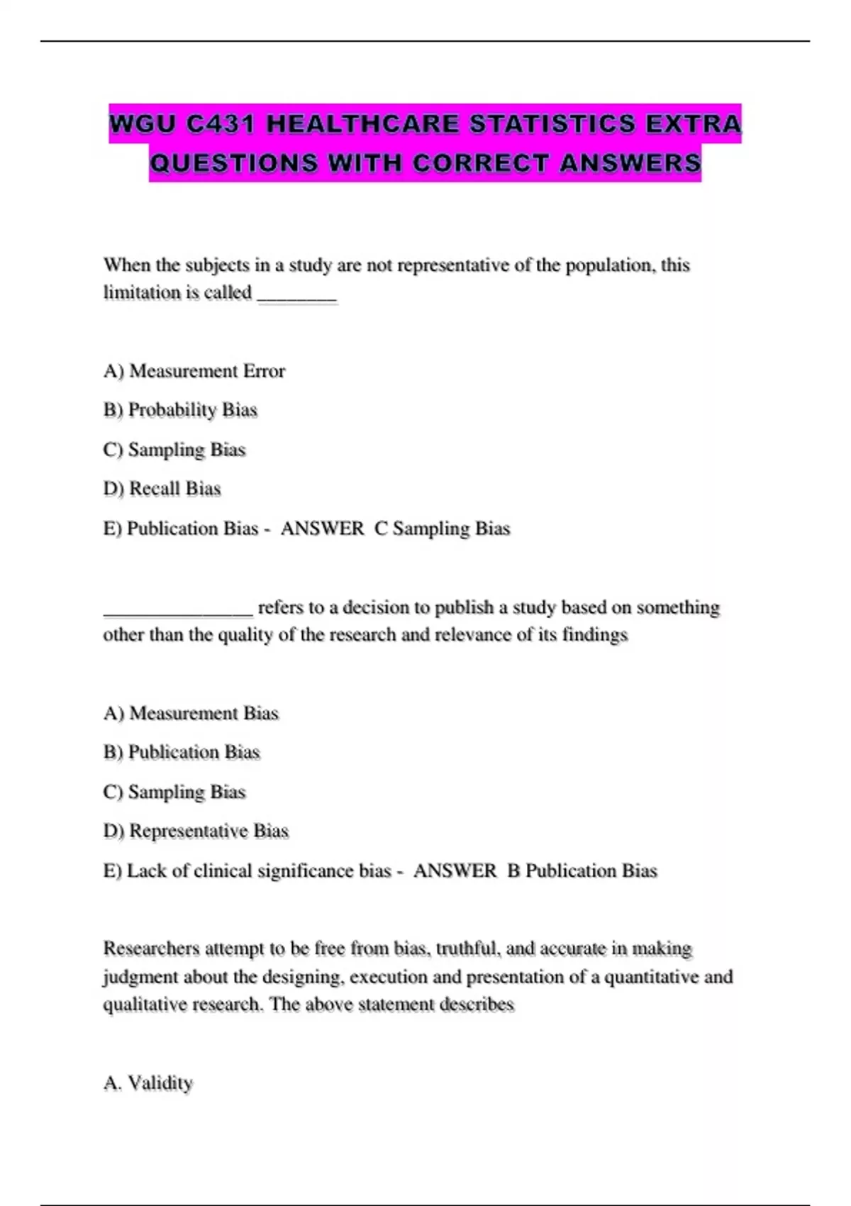 WGU C431 HEALTHCARE STATISTICS EXTRA QUESTIONS WITH CORRECT ANSWERS....
