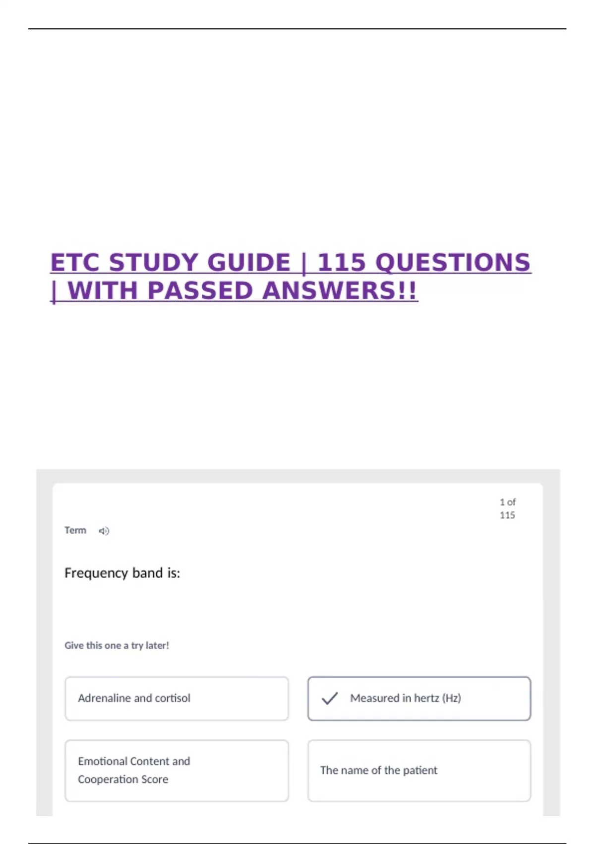 ETC STUDY GUIDE | 115 QUESTIONS | WITH PASSED ANSWERS!!