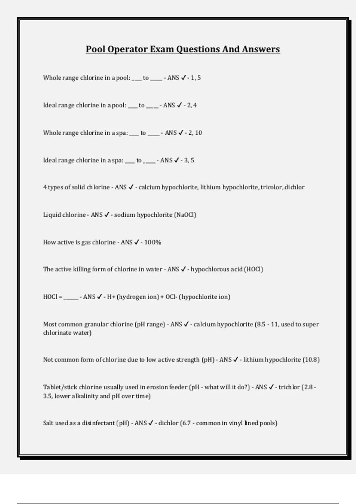 Whole range chlorine in a pool: ____ to _____ - ANS ✔ - 1, 5