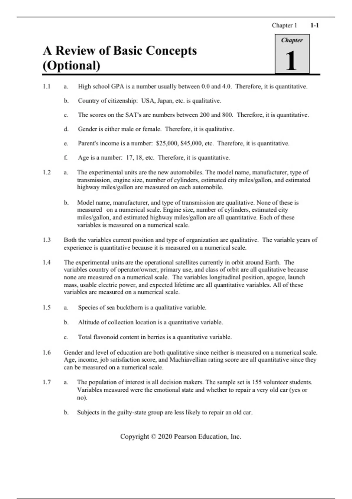 1.1 a. High school GPA is a number usually between 0.0 and 4.0. Therefore, it is quantitative.