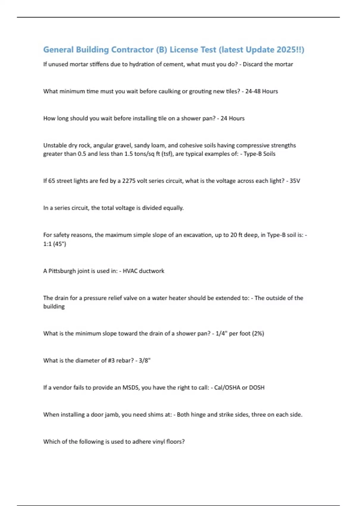 General Building Contractor (B) License Test (latest Update 2025!!) If unused mortar stiffens due to hydration of cement, what must you do? - Discard the mortar What minimum time must you wait before caulking or grouting new tiles? - 24-48 Hours How long should you wait before installing tile on a shower pan? - 24 Hours Unstable dry rock, angular gravel, sandy loam, and cohesive soils having compressive strengths greater than 0.5 and less than 1.5 tons/sq ft (tsf), are typical examples of: - Type-B Soils If 65 street lights are fed by a 2275 volt series circuit, what is the voltage across each light? - 35V In a series circuit, the total voltage is divided equally. For safety reasons, the maximum simple slope of an excavation, up to 20 ft deep, in Type-B soil is: