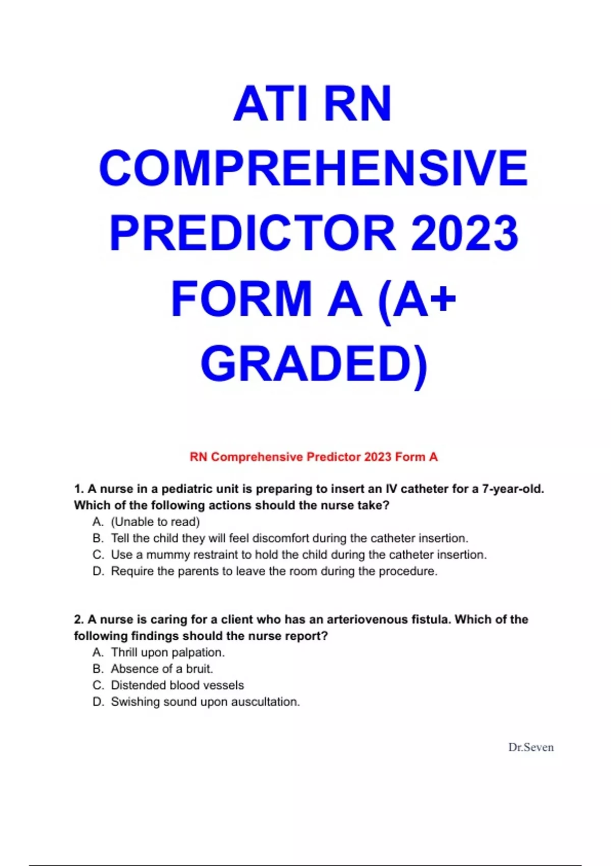 RNComprehensive Predictor 2023 Form A 1. A nurse in a pediatric unit is preparing to insert an IV catheter for a 7-year-old. Which of the following actions should the nurse take? A. (Unable to read) B. Tell the child they will feel discomfort during the catheter insertion. C. Use a mummyrestraint to hold the child during the catheter insertion. D. Require the parents to leave the room during the procedure. 2. A nurse is caring for a client who has an arteriovenous fistula. Which of the following findings should the nurse report? A. Thrill upon palpation. B. Absence of a bruit. C. Distended blood vessels D. Swishing sound upon auscultation.