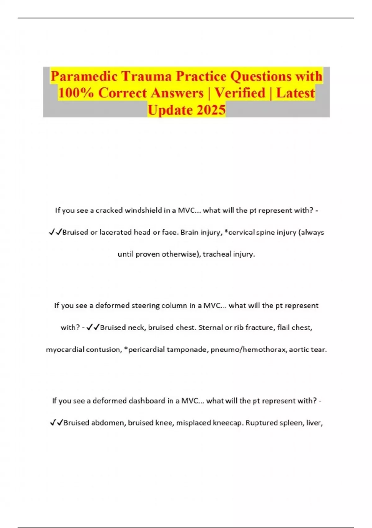 Paramedic Trauma Practice Questions with 100% Correct Answers | Verified | Latest Update 2025