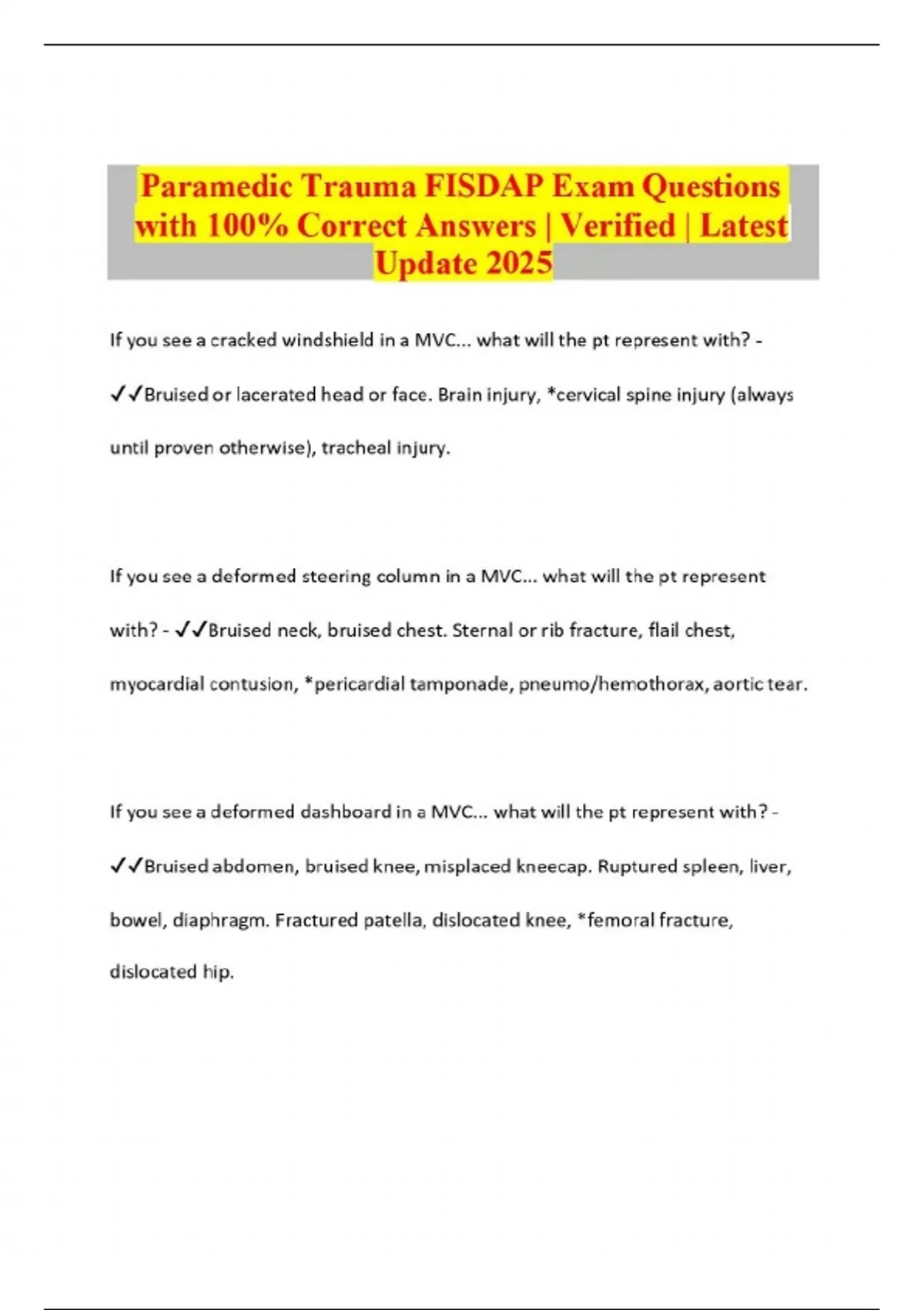 Paramedic Trauma FISDAP Exam Questions with 100% Correct Answers | Verified | Latest Update 2025