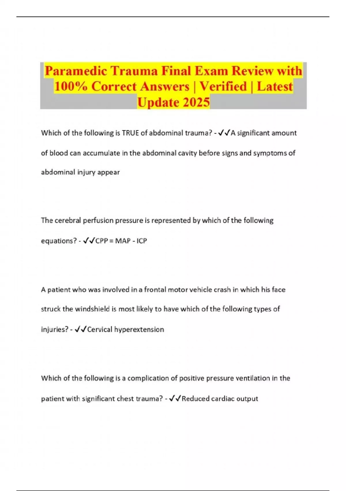 Paramedic Trauma Final Exam Review with 100% Correct Answers | Verified | Latest Update 2025