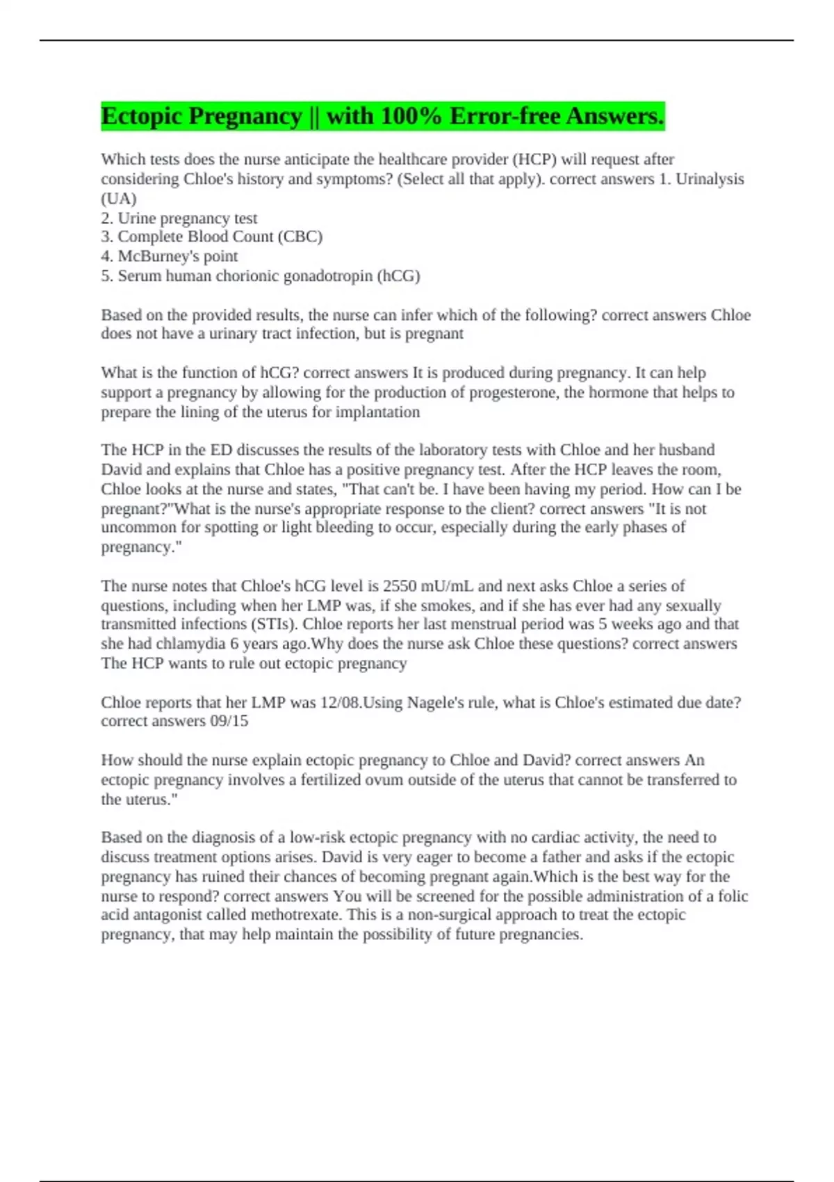 Which tests does the nurse anticipate the healthcare provider (HCP) will request after considering Chloe's history and symptoms? (Select all that apply). correct answers 1. Urinalysis (UA) 2. Urine pregnancy test 3. Complete Blood Count (CBC) 4. McBurney's point 5. Serum human chorionic gonadotropin (hCG) Based on the provided results, the nurse can infer which of the following? correct answers Chloe does not have a urinary tract infection, but is pregnant What is the function of hCG? correct answers It is produced during pregnancy. It can help support a pregnancy by allowing for the production of progesterone, the hormone that helps to prepare the lining of the uterus for implantation The HCP in the ED discusses the results of the laboratory tests with Chloe and her husband David and explains that Chloe has a positive pregnancy test. After the HCP leaves the room, Chloe looks at the nurse and states, "That can't be. I have been having my period. How can I be pregnant?"What is the nurse's appropriate response to the client? correct answers "It is not uncommon for spotting or light bleeding to occur, especially during the early phases of pregnancy." The nurse notes that Chloe's hCG level is 2550 mU/mL and next asks Chloe a series of questions, including when her LMP was, if she smokes, and if she has ever had any sexually transmitted infections (STIs). Chloe reports her last menstrual period was 5 weeks ago and that she had chlamydia 6 years ago.Why does the nurse ask Chloe these questions? correct answers The HCP wants to rule out ectopic pregnancy Chloe reports that her LMP was 12/08.Using Nagele's rule, what is Chloe's estimated due date? correct answers 09/15 How should the nurse explain ectopic pregnancy to Chloe and David? correct answers An ectopic pregnancy involves a fertilized ovum outside of the uterus that cannot be transferred to the uterus." Based on the diagnosis of a low-risk ectopic pregnancy with no cardiac activity, the need to discuss treatment options arises. David is very eager to become a father and asks if the ectopic pregnancy has ruined their chances of becoming pregnant again.Which is the best way for the nurse to respond? correct answers You will be screened for the possible administration of a folic acid antagonist called methotrexate. This is a non-surgical approach to treat the ectopic pregnancy, that may help maintain the possibility of future pregnancies.