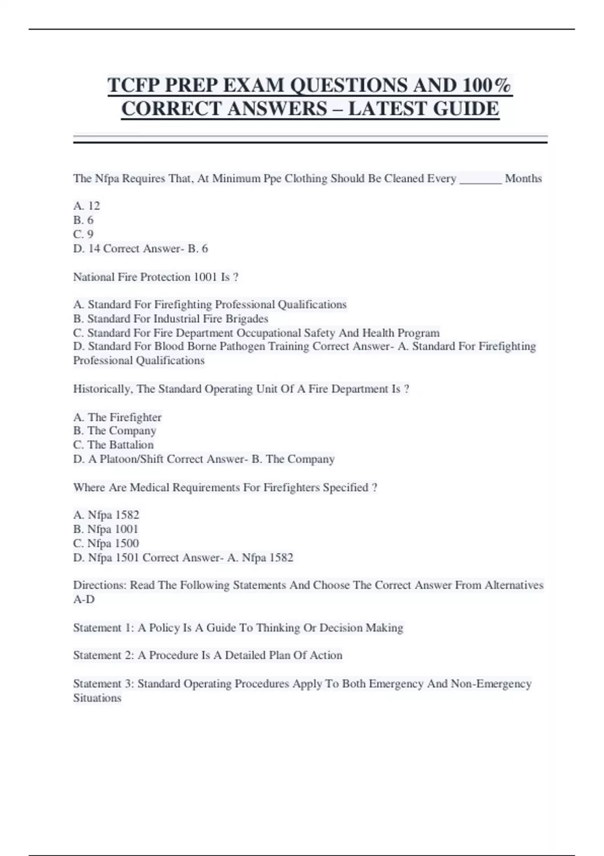 TCFP PREP EXAM QUESTIONS AND 100% CORRECT ANSWERS – LATEST GUIDE The Nfpa Requires That, At Minimum Ppe Clothing Should Be Cleaned Every _______ Months A. 12 B. 6 C. 9 D. 14 Correct Answer- B. 6