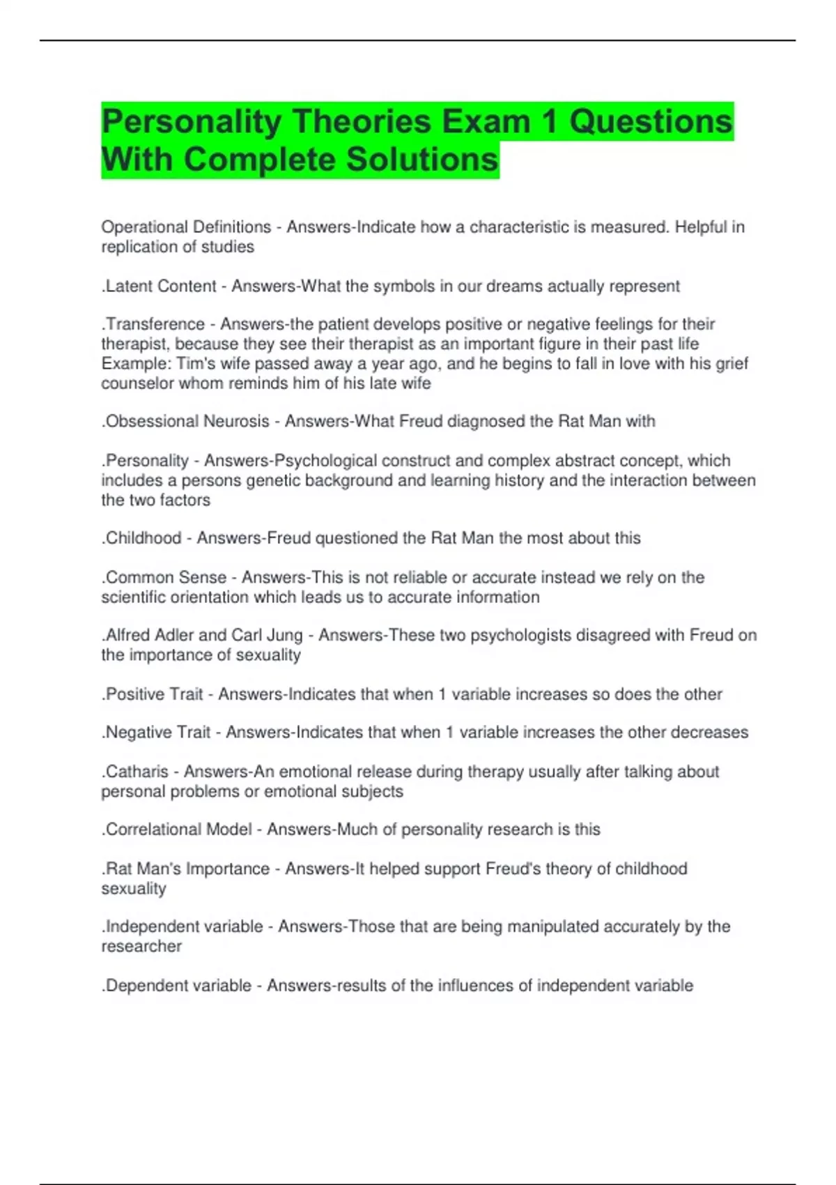 Personality Theories Exam 1 Questions With Complete Solutions Operational Definitions - Answers-Indicate how a characteristic is measured. Helpful in replication of studies .Latent Content - Answers-What the symbols in our dreams actually represent .Transference - Answers-the patient develops positive or negative feelings for their therapist, because they see their therapist as an important figure in their past life Example: Tim's wife passed away a year ago, and he begins to fall in love with his grief counselor whom reminds him of his late wife .Obsessional Neurosis - Answers-What Freud diagnosed the Rat Man with .Personality - Answers-Psychological construct and complex abstract concept, which includes a persons genetic background and learning history and the interaction between the two factors .Childhood - Answers-Freud questioned the Rat Man the most about this .Common Sense - Answers-This is not reliable or accurate instead we rely on the scientific orientation which leads us to accurate information .Alfred Adler and Carl Jung - Answers-These two psychologists disagreed with Freud on the importance of sexuality .Positive Trait - Answers-Indicates that when 1 variable increases so does the other .Negative Trait - Answers-Indicates that when 1 variable increases the other decreases .Catharis - Answers-An emotional release during therapy usually after talking about personal problems or emotional subjects .Correlational Model - Answers-Much of personality research is this .Rat Man's Importance - Answers-It helped support Freud's theory of childhood sexuality .Independent variable - Answers-Those that are being manipulated accurately by the researcher .Dependent variable - Answers-results of the influences of independent variable
