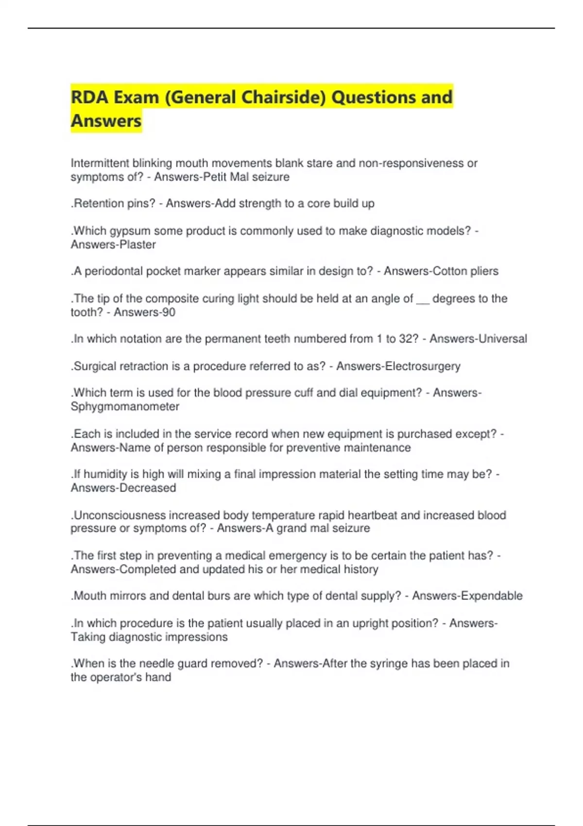 RDA Exam (General Chairside) Questions and