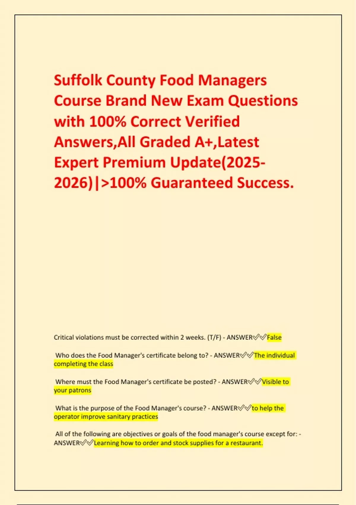 Critical violations must be corrected within 2 weeks. (T/F) - ANSWER✅✅False
