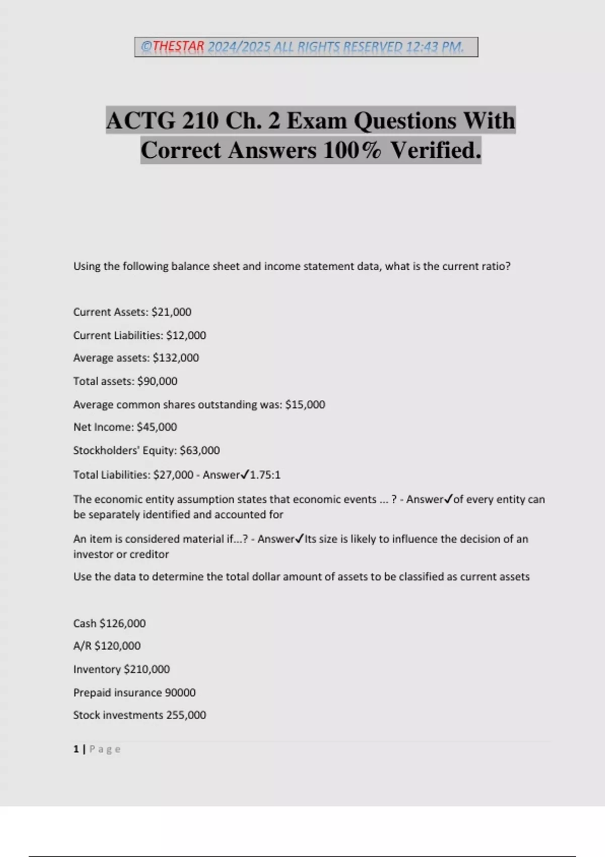 ©THESTAR 2024/2025 ALL RIGHTS RESERVED 12:43 PM. 1 | P a g e ACTG 210 Ch. 2 Exam Questions With Correct Answers 100% Verified. Using the following balance sheet and income statement data, what is the current ratio? Current Assets: $21,000 Current Liabilities: $12,000 Average assets: $132,000 Total assets: $90,000 Average common shares outstanding was: $15,000 Net Income: $45,000 Stockholders' Equity: $63,000 Total Liabilities: $27,000 - Answer1.75:1 The economic entity assumption states that economic events ... ? - Answerof every entity can be separately identified and accounted for An item is considered material if...? - AnswerIts size is likely to influence the decision of an investor or creditor Use the data to determine the total dollar amount of assets to be classified as current assets Cash $126,000 A/R $120,000 Inventory $210,000 Prepaid insurance 90000 Stock investments 255,000