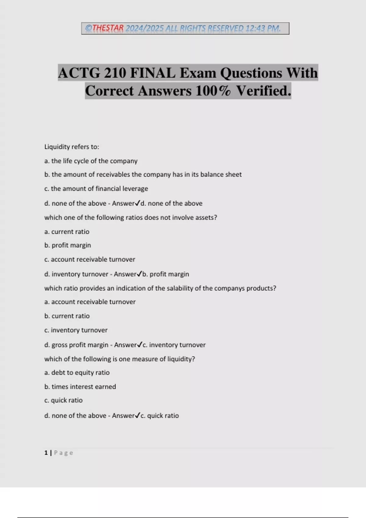 ©THESTAR 2024/2025 ALL RIGHTS RESERVED 12:43 PM. 1 | P a g e ACTG 210 FINAL Exam Questions With Correct Answers 100% Verified. Liquidity refers to: a. the life cycle of the company b. the amount of receivables the company has in its balance sheet c. the amount of financial leverage d. none of the above - Answerd. none of the above which one of the following ratios does not involve assets? a. current ratio b. profit margin c. account receivable turnover d. inventory turnover - Answerb. profit margin which ratio provides an indication of the salability of the companys products? a. account receivable turnover b. current ratio c. inventory turnover d. gross profit margin - Answerc. inventory turnover which of the following is one measure of liquidity? a. debt to equity ratio b. times interest earned c. quick ratio d. none of the above - Answerc. quick ratio