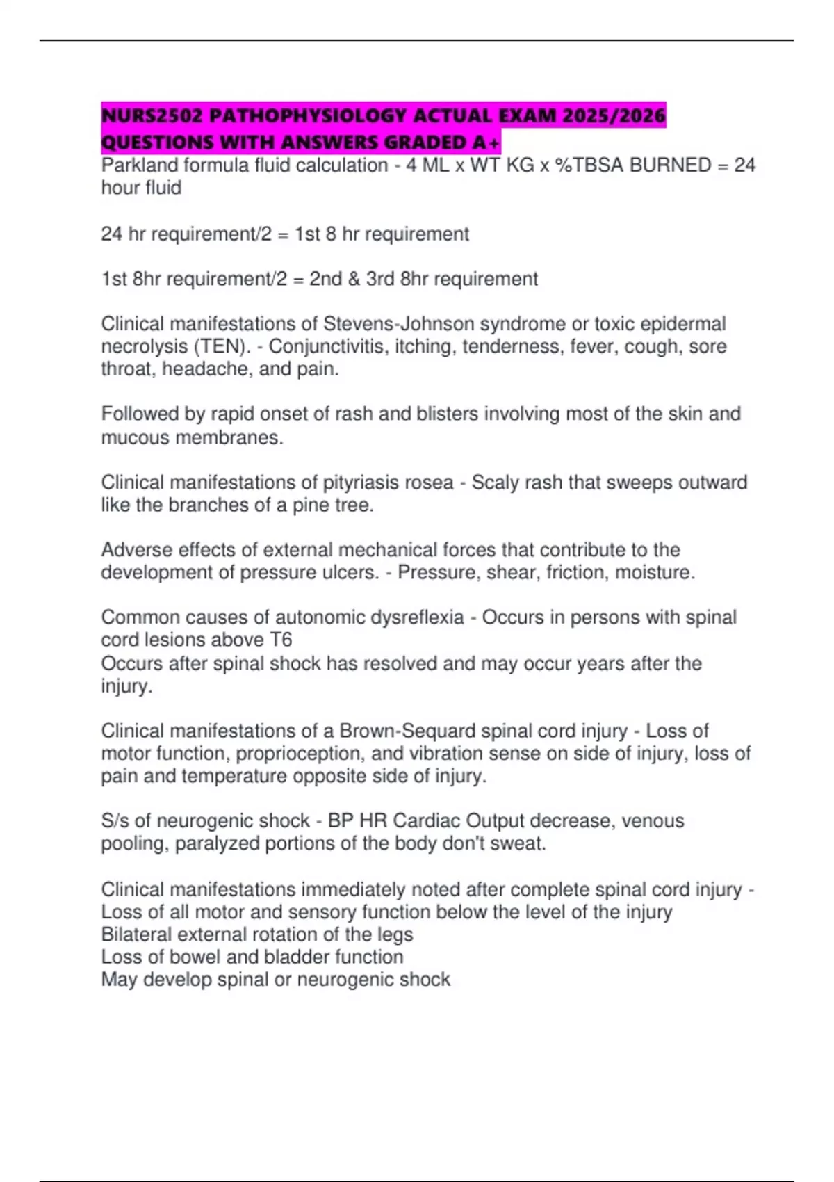 NURS2502 PRACTICE EXAM 2025/2026 EVALUATION QUESTIONS WITH ANSWERS GRADED A+ onset of rash and blisters involving most of the skin and mucous membranes. Clinical manifestations of pityriasis rosea - Scaly rash that sweeps outward like the branches of a pine tree. Adverse effects of external mechanical forces that contribute to the development of pressure ulcers. - Pressure, shear, friction, moisture. Common causes of autonomic dysreflexia - Occurs in persons with spinal cord lesions above T6 Occurs after spinal shock has resolved and may occur years after the injury. Clinical manifestations of a Brown-Sequard spinal cord injury - Loss of motor function, proprioception, and vibration sense on side of injury, loss of pain and temperature opposite side of injury. S/s of neurogenic shock - BP HR Cardiac Output decrease, venous pooling, paralyzed portions of the body don't sweat.