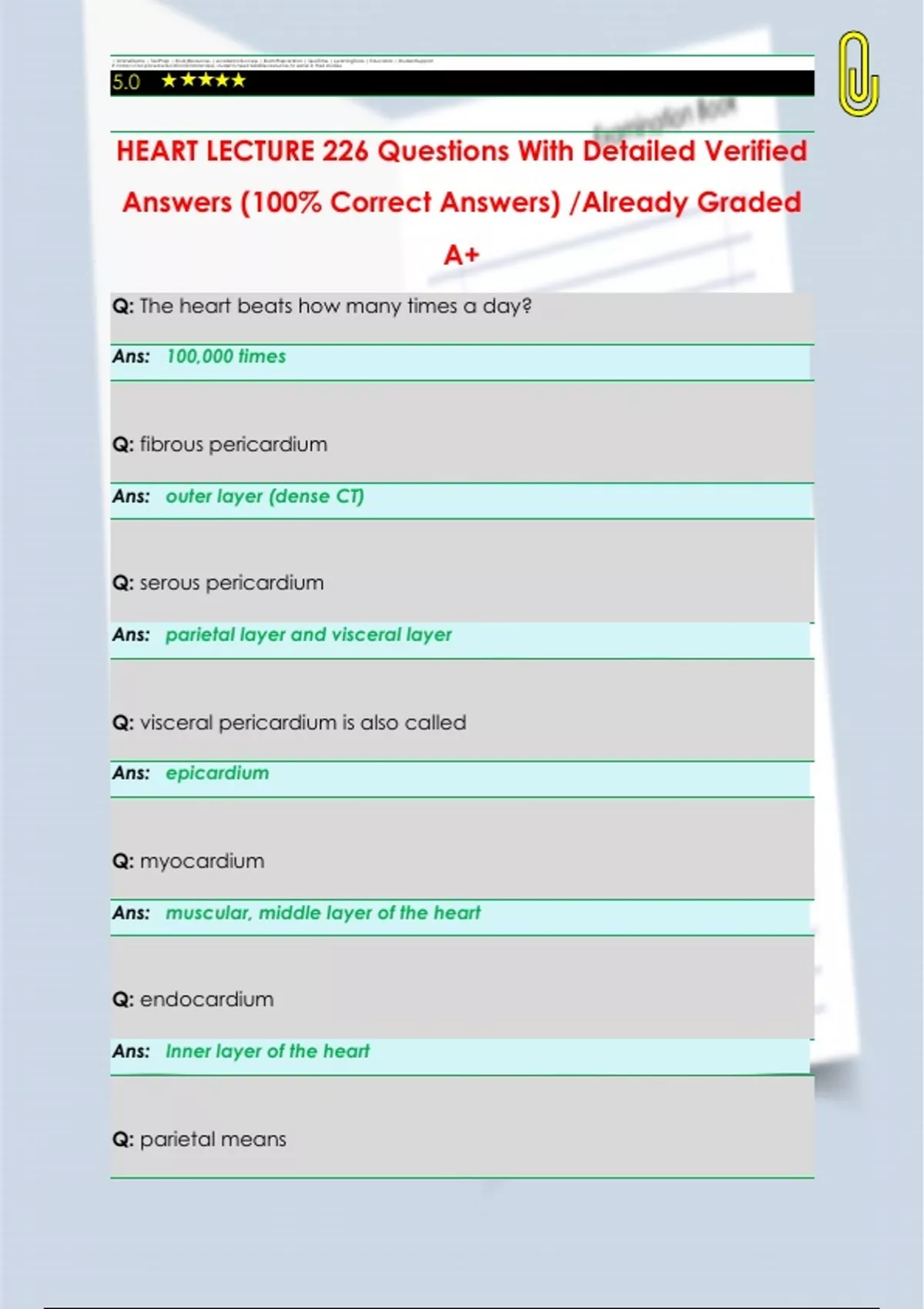 Q: The heart beats how many times a day? Ans: 100,000 times Q: fibrous pericardium Ans: outer layer (dense CT) Q: serous pericardium Ans: parietal layer and visceral layer Q: visceral pericardium is also called Ans: epicardium Q: myocardium Ans: muscular, middle layer of the heart Q: endocardium Ans: Inner layer of the heart Q: parietal means Examstudy - Stuvia US Ans: membrane that lines the cavity Q: visceral means Ans: lines external surface of organ Q: heart is located Ans: midline of the body just a little to the left, right behind the sternum Q: atria are the: Ans: filling/receiving chambers of the heart Q: Each atrium has a protrudin