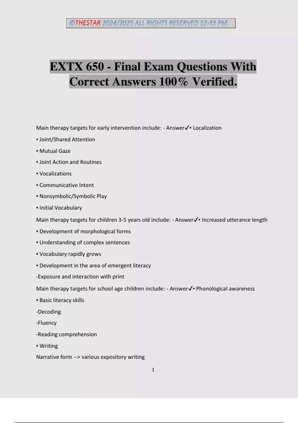 ©THESTAR 2024/2025 ALL RIGHTS RESERVED 12:43 PM. 1 EXTX 650 - Final Exam Questions With Correct Answers 100% Verified. Main therapy targets for early intervention include: - Answer▪ Localization ▪ Joint/Shared Attention ▪ Mutual Gaze ▪ Joint Action and Routines ▪ Vocalizations ▪ Communicative Intent ▪ Nonsymbolic/Symbolic Play ▪ Initial Vocabulary Main therapy targets for children 3-5 years old include: - Answer▪ Increased utterance length ▪ Development of morphological forms ▪ Understanding of complex sentences ▪ Vocabulary rapidly grows ▪ Development in the area of emergent literacy -Exposure and interaction with print Main therapy targets for school age children include: - Answer▪ Phonological awareness ▪ Basic literacy skills -Decoding -Fluency -Reading comprehension ▪ Writing Narrative form -- various expository writing ©THESTAR 2024/2025 ALL RIGHTS RESERVED 12:43 PM. 2 Which therapy strategy focuses on building the foundations of social, emotional, and intellectual capacities in young children? - AnswerFloortime/Developmental, Individual Difference, Relationship-Based (DIR) To what age range does the term "early intervention" refer? - AnswerBirth-3 years Shared book reading should incorporate: - Answer▪ When choosing books: -Expose the child to a variety of genres of literature at developmentally appropriate content and complexity -Select patterned stories with repetitive themes and well-developed plot structure ▪ While reading: -Ask questions (e.g., what happened, what might happen next) -Engage in print referencing (i.e., highlight aspects of print with comments, gestures, and tracking print) -Encourage recounting of familiar experiences in daily life (e.g., grocery shopping) and personal event narratives (e.g., daddy cooking dinner) Phonological Awareness includes: - Answer▪ A metalinguistic skill involving the manipulation of the sound structure of language through the rhyming, blending, and segmenting of words, syllables, or phonemes. ▪ A child's control of sounds at the phoneme level is predictive of decoding and spelling skills. ▪ A common task is asking a child to say a word such as fat and then having them say it again without the /f/. ▪ Children and adolescents with language/learning impairments often display difficulty with these types of tasks, such as the one listed above. Voiced stops include: - Answer▪ /b, d, g/ ▪ (Pretty sure this is wrong) Substitution of a stop for a fricative or affricate ▪ EX: /top/ for soap ▪ Stopping of 'v' and 'z' outgrown by 4yrs ▪ Stopping of 'sh, ch, j' voiced and voiceless 'th' outgrown by 5yrs Example of this process is /tæn/ for pan - Answer▪ Alveolarization -Substitution of an alveolar phoneme for a labial or linguadental phoneme -Outgrown by 5yrs