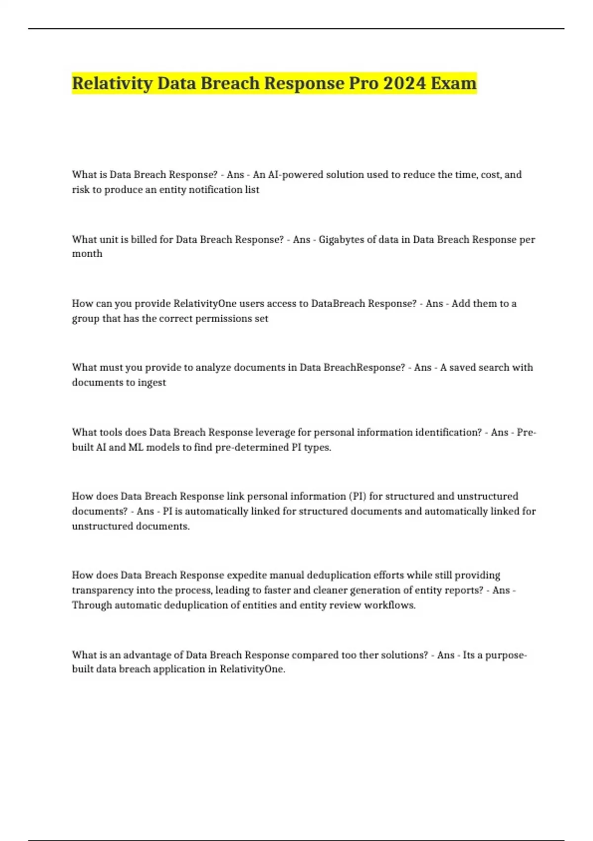 Relativity Data Breach Response Pro 2024 Exam