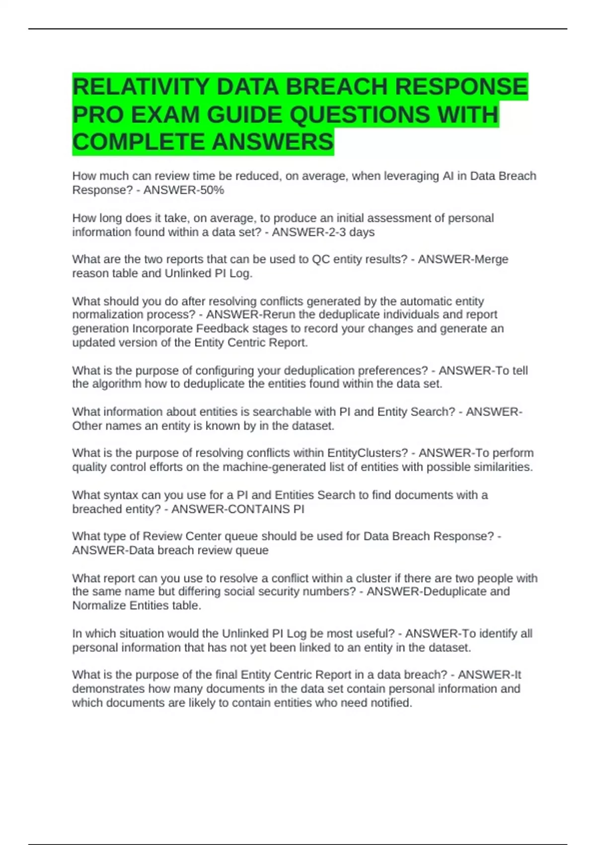 RELATIVITY DATA BREACH RESPONSE PRO EXAM GUIDE QUESTIONS WITH COMPLETE ANSWERS