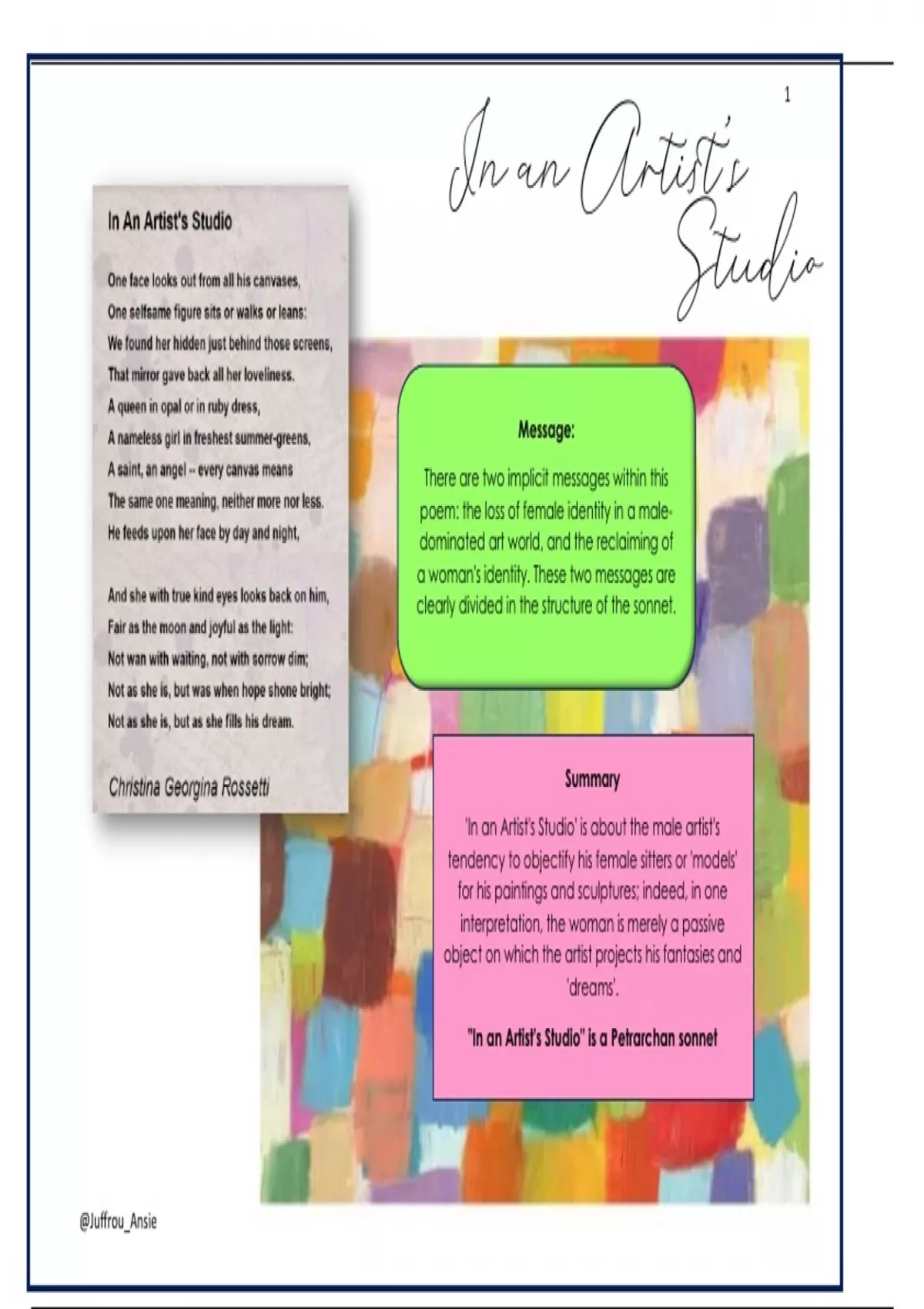 In an artist’s studio-Message: There are two implicit messages within this poem: the loss of female identity in a male dominated art world, and the reclaiming of a woman's identity. These two messages are clearly divided in the structure of the sonnet. Colourful and easy to understand different concepts, covered the important information asked in tests/ exams.. Various topics discussed.