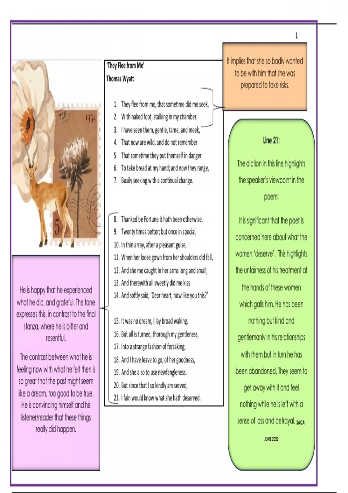 Summary ‘They Flee from Me’ Thomas Wyatt--A detailed analysis by @ Juffrou Ansie – compact and colourful analysis based on previous exam papers!