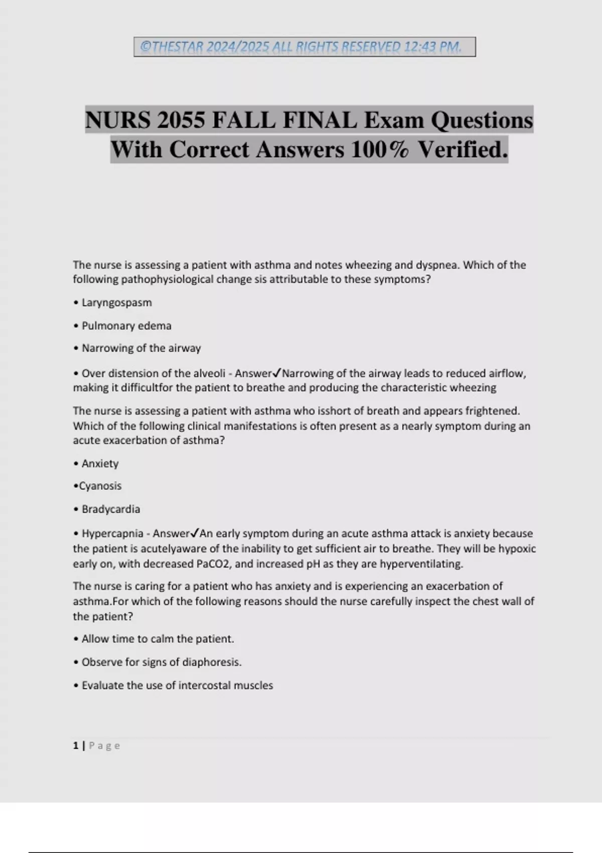 ©THESTAR 2024/2025 ALL RIGHTS RESERVED 12:43 PM. 1 | P a g e NURS 2055 FALL FINAL Exam Questions With Correct Answers 100% Verified. The nurse is assessing a patient with asthma and notes wheezing and dyspnea. Which of the following pathophysiological change sis attributable to these symptoms? • Laryngospasm • Pulmonary edema • Narrowing of the airway • Over distension of the alveoli - AnswerNarrowing of the airway leads to reduced airflow, making it difficultfor the patient to breathe and producing the characteristic wheezing The nurse is assessing a patient with asthma who isshort of breath and appears frightened. Which of the following clinical manifestations is often present as a nearly symptom during an acute exacerbation of asthma? • Anxiety •Cyanosis • Bradycardia • Hypercapnia - AnswerAn early symptom during an acute asthma attack is anxiety because the patient is acutelyaware of the inability to get sufficient air to breathe. They will be hypoxic early on, with decreased PaCO2, and increased pH as they are hyperventilating. The nurse is caring for a patient who has anxiety and is experiencing an exacerbation of asthma.For which of the following reasons should the nurse carefully inspect the chest wall of the patient? • Allow time to calm the patient. • Observe for signs of diaphoresis. • Evaluate the use of intercostal muscles ©THESTAR 2024/2025 ALL RIGHTS RESERVED 12:43 PM. 2 | P a g e • Monitor the patient for bilateral chest expansion. - AnswerThe nurse physically inspects the chest wall to evaluate the use of intercostal (accessory) muscles, which gives an indication of the degree of respiratory distress experienced by the patient. Which of the following positions is best for the nurse to place apatient whois experiencing an asthma exacerbation? • Supine • Lithotomy • High Fowler's • Reverse Trendelenburg - AnswerHigh Fowler's The nurse is caring for a patient with an acute exacerbation of asthma. Following initial treatment,which of the following findings indicates to the nurse that the patient's respiratory status is improving? • Wheezing becomes louder • Vesicular breath sounds decrease • The cough remains non-productive • Aerosol bronchodilators stimulate coughing - AnswerThe primary problem during an exacerbation of asthma is narrowing of the airway and subsequent diminished air exchange. As the airways begin to dilate, wheezing gets louder because of better air exchange. The nurse identifies the nursing diagnosis of activity intolerance for a patient with asthma. Which of the following etiological factors should the nurse assess in the patient? • Work of breathing Fear of suffocation • Effects of medications • Anxiety and restlessness - AnswerWhen the patient does not have sufficient gas exchange to engage in activity, the etiologicalfactor is often the work of breathing. When patients with asthma do not have effective respirations, they use all available energy to breathe and have little left over for purposeful activity. The nurse is caring for a patient with an acute exacerbation of chronic obstructive pulmonary disease (COPD) who needs to receive precise amounts of oxygen. Which of the following types of equipment should the nurse prepare touse? • Oxygen tent • Venturi mas