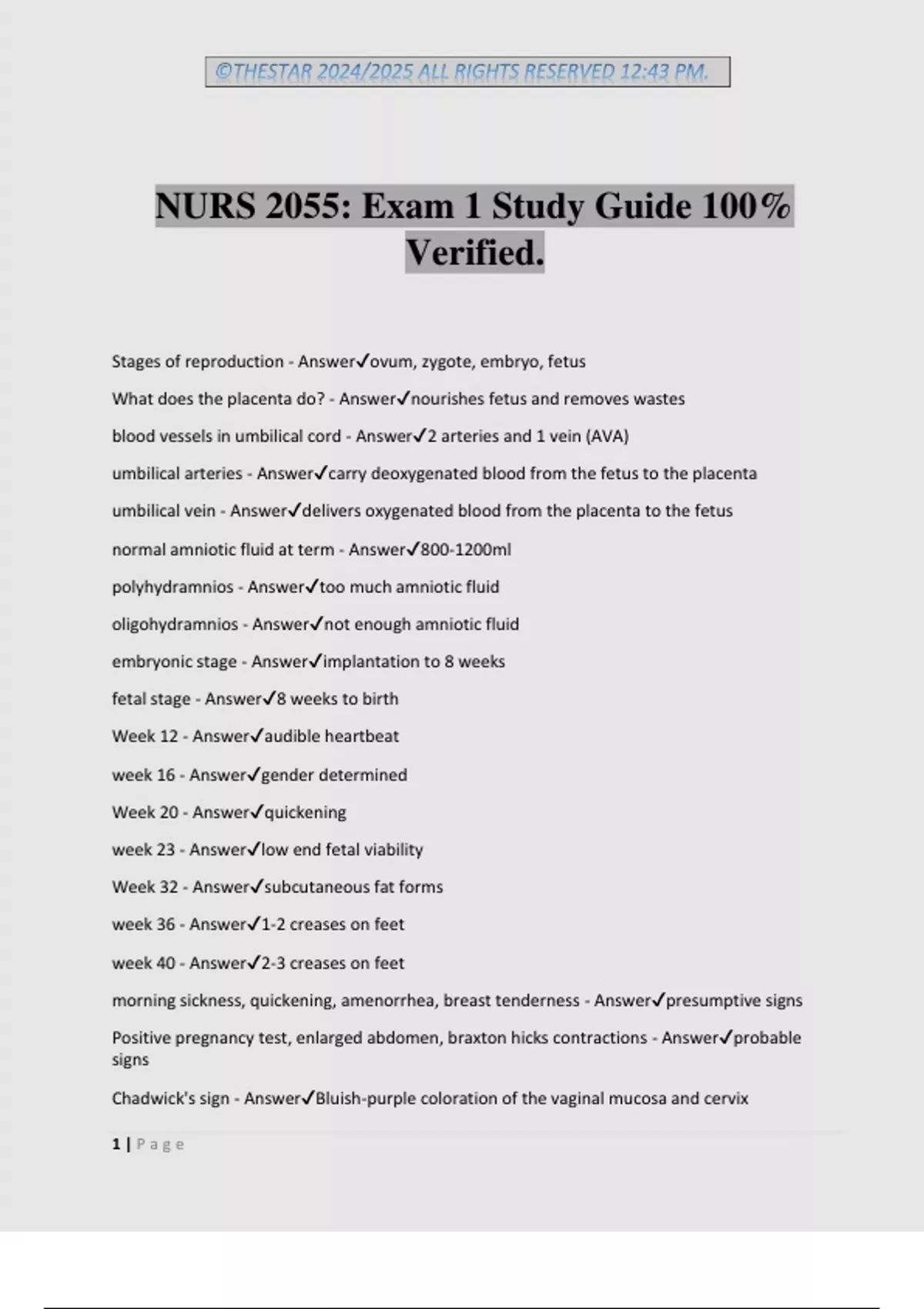 ©THESTAR 2024/2025 ALL RIGHTS RESERVED 12:43 PM. 1 | P a g e NURS 2055: Exam 1 Study Guide 100% Verified. Stages of reproduction - Answerovum, zygote, embryo, fetus What does the placenta do? - Answernourishes fetus and removes wastes blood vessels in umbilical cord - Answer2 arteries and 1 vein (AVA) umbilical arteries - Answercarry deoxygenated blood from the fetus to the placenta umbilical vein - Answerdelivers oxygenated blood from the placenta to the fetus normal amniotic fluid at term - Answer800-1200ml polyhydramnios - Answertoo much amniotic fluid oligohydramnios - Answernot enough amniotic fluid embryonic stage - Answerimplantation to 8 weeks fetal stage - Answer8 weeks to birth Week 12 - Answeraudible heartbeat week 16 - Answergender determined Week 20 - Answerquickening week 23 - Answerlow end fetal viability Week 32 - Answersubcutaneous fat forms week 36 - Answer1-2 creases on feet week 40 - Answer2-3 creases on feet morning sickness, quickening, amenorrhea, breast tenderness - Answerpresumptive signs Positive pregnancy test, enlarged abdomen, braxton hicks contractions - Answerprobable signs Chadwick's sign - AnswerBluish-purple