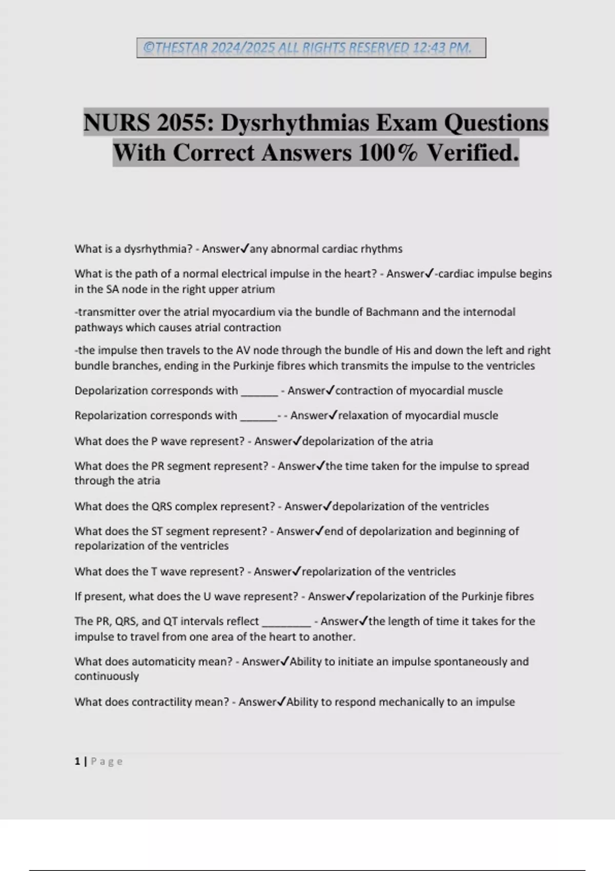 ©THESTAR 2024/2025 ALL RIGHTS RESERVED 12:43 PM. 1 | P a g e NURS 2055: Dysrhythmias Exam Questions With Correct Answers 100% Verified. What is a dysrhythmia? - Answerany abnormal cardiac rhythms What is the path of a normal electrical impulse in the heart? - Answer-cardiac impulse begins in the SA node in the right upper atrium -transmitter over the atrial myocardium via the bundle of Bachmann and the internodal pathways which causes atrial contraction -the impulse then travels to the AV node through the bundle of His and down the left and right bundle branches, ending in the Purkinje fibres which transmits the impulse to the ventricles Depolarization corresponds with ______ - Answercontraction of myocardial muscle Repolarization corresponds with ______- - Answerrelaxation of myocardial muscle What does the P wave represent? - Answerdepolarization of the atria What does the PR segment represent? - Answerthe time taken for the impulse to spread through the atria What does the QRS complex represent? - Answerdepolarization of the ventricles What does the ST segment represent? - Answerend of depolarization and beginning of repolarization of the ventricles What does the T wave represent? - Answerrepolarization of the ventricles If present, what does the U wave represent? - Answerrepolarization of the Purkinje fibres The PR, QRS, and QT intervals reflect ________ - Answerthe length of time it takes for the impulse to travel from one area of the heart to another. What does automaticity mean? - AnswerAbility to initiate an impulse spontaneously and continuously What does contractility mean? - AnswerAbility to respond mechanically to an impulse ©THESTAR 2024/2025 ALL RIGHTS RESERVED 12:43 PM. 2 | P a g e What does conductivity mean? - AnswerAbility to transmit an impulse along a membrane in an orderly manner What does excitability mean? - AnswerAbility to be electrically stimulated What is the normal duration of the P wave? - Answer0.06-0.12 seconds What is the normal duration of the PR interval? - Answer0.12-0.2 seconds What is the normal duration of the QRS interval? - Answer0.06-0.1 seconds The autonomic nervous system played an important role in ______ - Answerthe rate of impulse formation, the speed of conduction, and the strength of cardiac contraction What does ECG stand for? - Answerelectrocardiogram monitoring What is an ECG? - AnswerGraphic tracing of electrical impulses produced by the heart Waveforms of ECG represent ______ - AnswerWaveforms of ECG represent activity of charged ions across membranes of myocardial cells. (depolarization and repolarization) Potassium is ___ in the cell whereas sodium is ____ in the cell - Answerhigh low When the cell is at rest, or in a repolarized state, it is _____. - Answernegative compared to the outside During depolarization the cell is ____ compared to the outside of the cell. - AnswerPositive Each small square on an ECG represents ______ - Answer0.04 seconds and 0.1mV Each large square on an ECG represents _____ - Answer0.2 seconds 0.5mV When we calculate heart rate form an ECG strip we are counting ____ - Answerthe number of QRS complexes in 1 minute What are the 3 ways we can calculate HR? - Answer1. # of R-R intervals= ___ x10= __ bpm 2. Large squares between R-R interval= 300/__ = __bpm 3. Small squares between R-R interval= 1500/__ = ___bpm What is an artifact? - Answerdefined as electrocardiographic alterations, not related to cardiac electrical activity (ie. too much hair on a patients chest) What are some examp