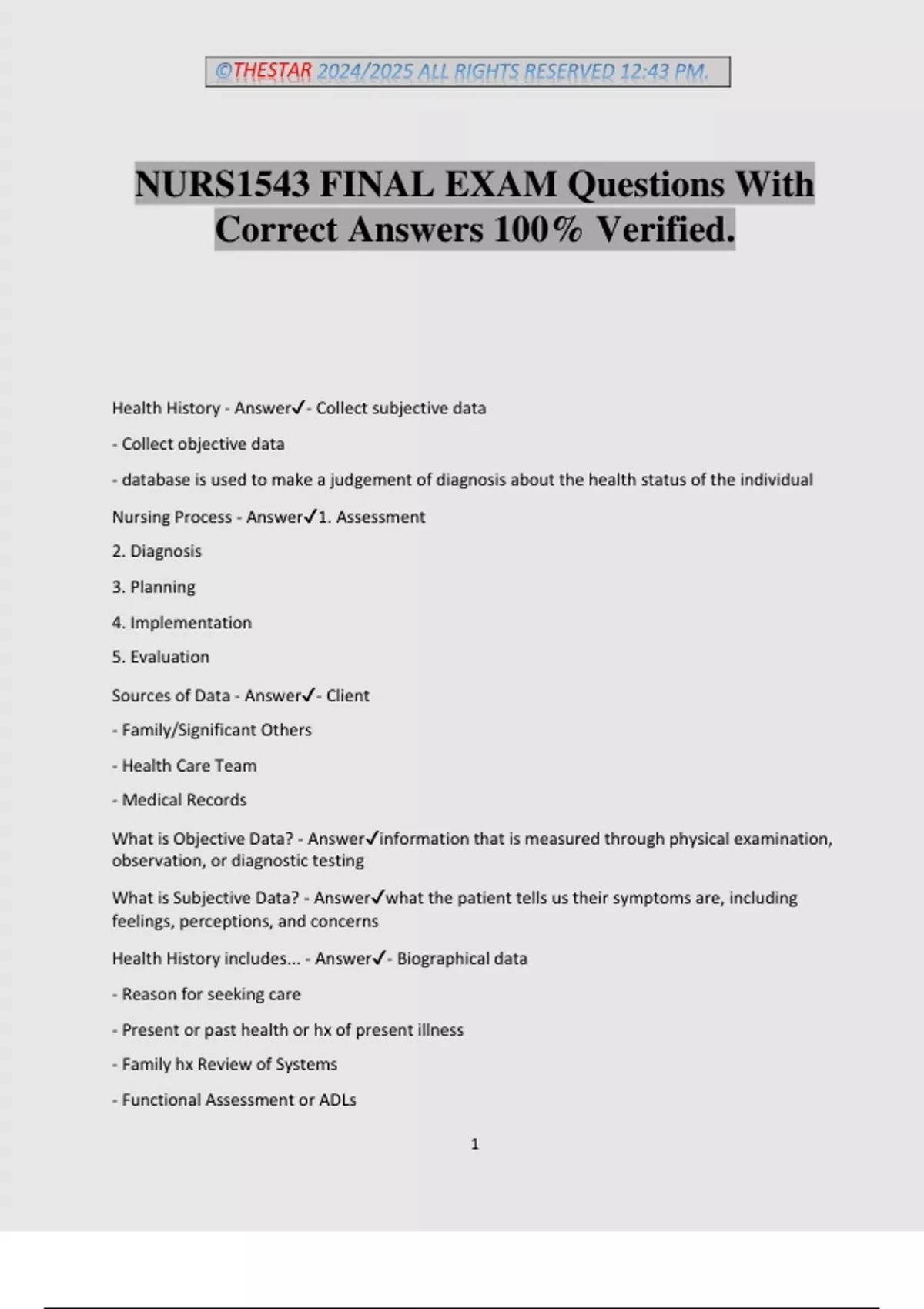©THESTAR 2024/2025 ALL RIGHTS RESERVED 12:43 PM. 1 NURS1543 FINAL EXAM Questions With Correct Answers 100% Verified. Health History - Answer- Collect subjective data - Collect objective data - database is used to make a judgement of diagnosis about the health status of the individual Nursing Process - Answer1. Assessment 2. Diagnosis 3. Planning 4. Implementation 5. Evaluation Sources of Data - Answer- Client - Family/Significant Others - Health Care Team - Medical Records What is Objective Data? - Answerinformation that is measured through physical examination, observation, or diagnostic testing What is Subjective Data? - Answerwhat the patient tells us their symptoms are, including feelings, perceptions, and concerns Health History includes... - Answer- Biographical data - Reason for seeking care - Present or past health or hx of present illness - Family hx Review of Systems - Functional Assessment or ADLs ©THESTAR 2024/2025 ALL RIGHTS RESERVED 12:43 PM. 2 Biographical Data - AnswerName Address and Phone # Age and DOB Birthplace Gender Marital status Ethnic Origin Occupation - usual and present Characteristics of Symptoms - AnswerLocation Character or quality Quantity or severity Timing Setting Aggravating or relieving factors Associated factors Patient's perception Past Health - AnswerChildhood illnesses Accidents or injuries Serious or chronic illnesses Hospitalizations Operations Obstetric history Immunizations Last examination date Allergies Current medication PQRSTU mnemonic stands for... - An