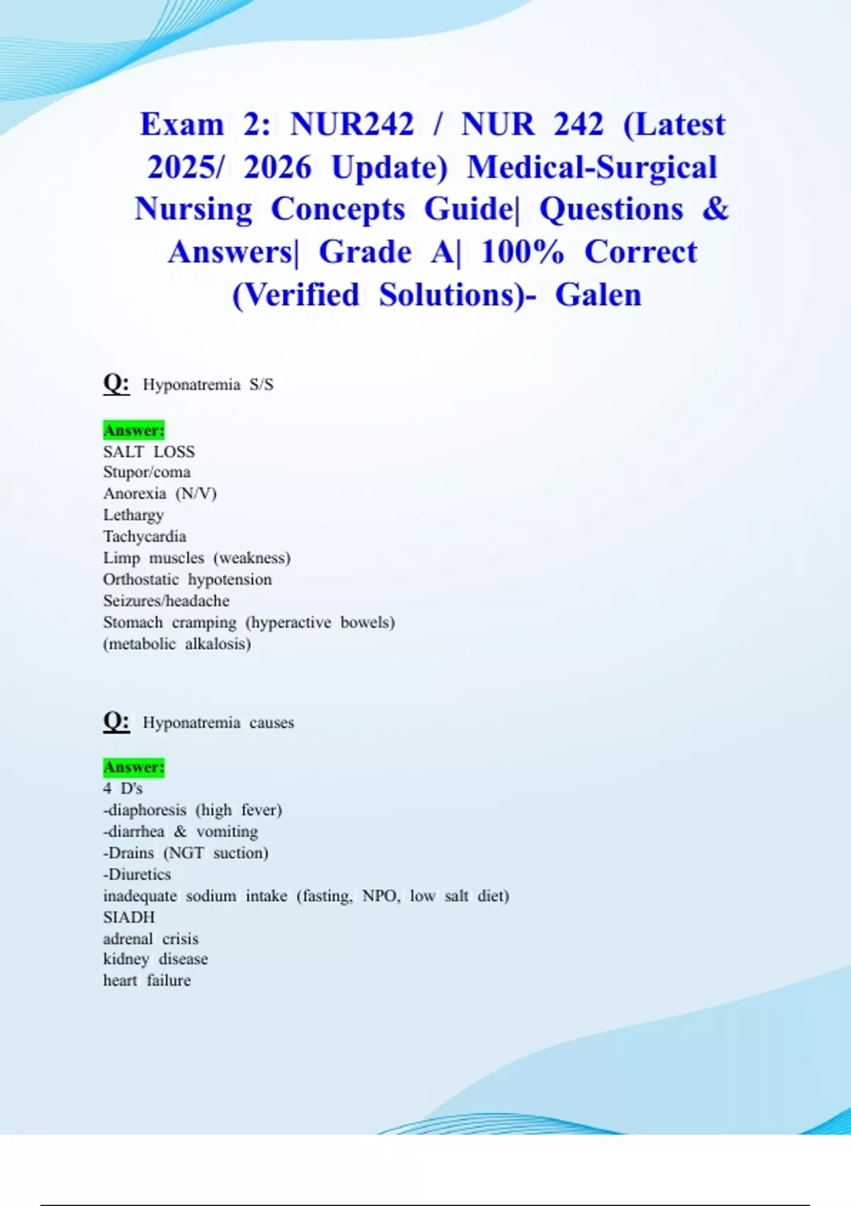 Exam 2: NUR242 / NUR 242 (Latest 2025/ 2026 Update) Medical-Surgical Nursing Concepts Guide| Questions & Answers| Grade A| 100% Correct (Verified Solutions)- Galen QUESTION Hyponatremia S/S Answer: SALT LOSS Stupor/coma Anorexia (N/V) Lethargy Tachycardia Limp muscles (weakness) Orthostatic hypotension Seizures/headache Stomach cramping (hyperactive bowels) (metabolic alkalosis) QUESTION Hyponatremia causes Answer: 4 D's -diaphoresis (high fever) -diarrhea & vomiting -Drains (NGT suction) -Diuretics inadequate sodium intake (fasting, NPO, low salt diet) SIADH adrenal crisis kidney disease heart failure QUESTION Hyponatremia treatment Answer: ADD SALT Administer IV sodium chloride (only if due to hypovolemia) Diuretics (Only if due to hypervolemia) Daily weights Safety (falls) Airway protection (NPO if confused) Limit water intake (only if due to hypervolemia) Teach foods high in sodium (canned, packaged, foods) QUESTION Hypernatremia S/S Answer: You are 'fried' or S.A.L.T. F - Fever (low grade), flushed skin R - Restless (irritable) I - Increased fluid retention and increased BP E - Edema (peripheral and pitting) D - Decreased urinary output, dry mouth S = Skin flushed A = Agitation L = Low-grade fever T = Thirst Big & Bloated metabolic acidois QUESTION Hypernatremia causes Answer: increased sodium intake fluid loss decreased sodium excreation QUESTION Hypernatermia treatment Answer: if due to fluid loss -administer IV infusions If causes is inadequate renal excretion -give diuretics restrict sodium and fluid as prescribed QUESTION Potassium (K+) normal range Answer: 3.5-5.0 mEq/L QUESTION Potassium function in body Answer: maintains ICF, nerve function, regulates muscle and heart contractions, acid base balance QUESTION 80% of potassium is excreted by Answer: kidneys QUESTION potassium food sources Answer: fish, meats, Citrus fruits and dried fruits, Bananas, Watermelon, Potatoes, tomatoes, Legumes, Tea, Peanut butter, and Spinach, QUESTION Watch Potassium levels in clients taking Answer: digitails diuretics iv fluids lower potassium QUESTION Hypokalemia S/S Answer: A SIC WALT Alkalosis Shallow respiration Irritability Confusion and drowsiness Weakness and fatigue Arrhythmias- irregular heart rate, tachycardia Lethargy Thready pulse decrease intestinal mobility, nausea and vomiting QUESTION Hypokalemia causes Answer: vomiting, NG suction, diuretics, corticosteriods kidney disease