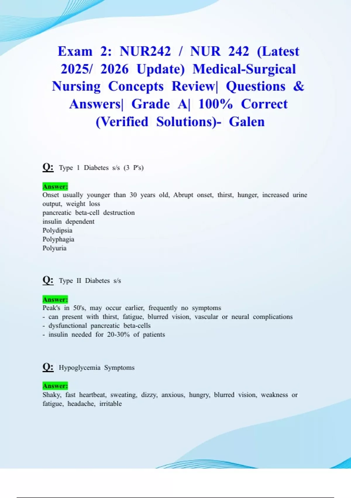 Exam 2: NUR242 / NUR 242 (Latest 2025/ 2026 Update) Medical-Surgical Nursing Concepts Review| Questions & Answers| Grade A| 100% Correct (Verified Solutions)- Galen QUESTION Type 1 Diabetes s/s (3 P's) Answer: Onset usually younger than 30 years old, Abrupt onset, thirst, hunger, increased urine output, weight loss pancreatic beta-cell destruction insulin dependent Polydipsia Polyphagia Polyuria QUESTION Type II Diabetes s/s Answer: Peak's in 50's, may occur earlier, frequently no symptoms - can present with thirst, fatigue, blurred vision, vascular or neural complications - dysfunctional pancreatic beta-cells - insulin needed for 20-30% of patients QUESTION Hypoglycemia Symptoms Answer: Shaky, fast heartbeat, sweating, dizzy, anxious, hungry, blurred vision, weakness or fatigue, headache, irritable QUESTION Hypoglycemia treatment Answer: check blood sugar, taking 30 to 4 glucose tablets or hard candies you chew quickly such as - peppermint or by drinking 4 ounces of fruit juice or 1/2 can of regular sod a - recheck blood sugar after 15 minutes. If still low, treat again QUESTION Hyperglycemia symptoms Answer: Extreme thirst, need to urinate often, dry skin, hungry, blurred vision, drowsy, QUESTION type 2 diabetes Answer: insulin resistance QUESTION Type 1 diabetes Answer: insulin dependent QUESTION Dawn phenomenon Answer: Early morning glucose elevation produced by the release of growth hormone, which decreases peripheral uptake of glucose resulting in elevated morning glucose levels. Admin of NPH insulin at a later time in day will coordinate insulin peak with the hormone release. QUESTION Somogyi phenomenon Answer: A rebound phenomenon that occurs in clients with type 1 diabetes mellitus. Normal or elevated blood glucose levels are present at bedtime; hypoglycemia occurs at about 2 to 3 am. Counterregulatory hormones, produced to prevent further hypoglycemia, result in hyperglycemia (evident in the prebreakfast blood glucose level). Treatment includes decreasing the evening (predinner or bedtime) dose of intermediate acting insulin or increasing the bedtime snack. QUESTION 3 S's that raise blood glucose Answer: stress, surgery, steroids QUESTION Treatment of mild hypoglycemia Answer: BS less then 70 - 15g of carbohyrates - glucose tablets - 120ml of fruit juice or soft drink - 240ml of skim milk - 6 to 10 candies - 4 cubes of sugar - 6 saltines - 3 gram crackers - 1 tbsp of honey or syrup