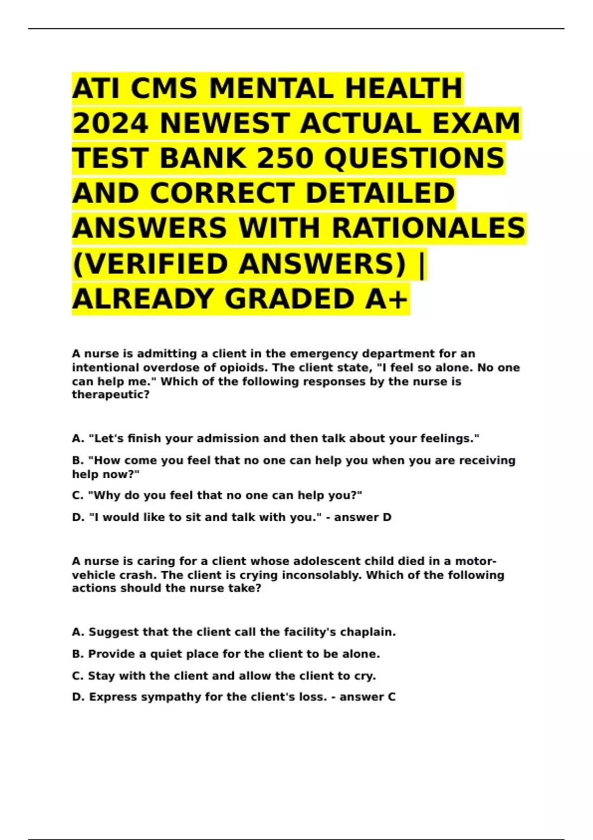 ATI CMS MENTAL HEALTH 2024 NEWEST ACTUAL EXAM TEST BANK 250 QUESTIONS AND CORRECT ANSWERS